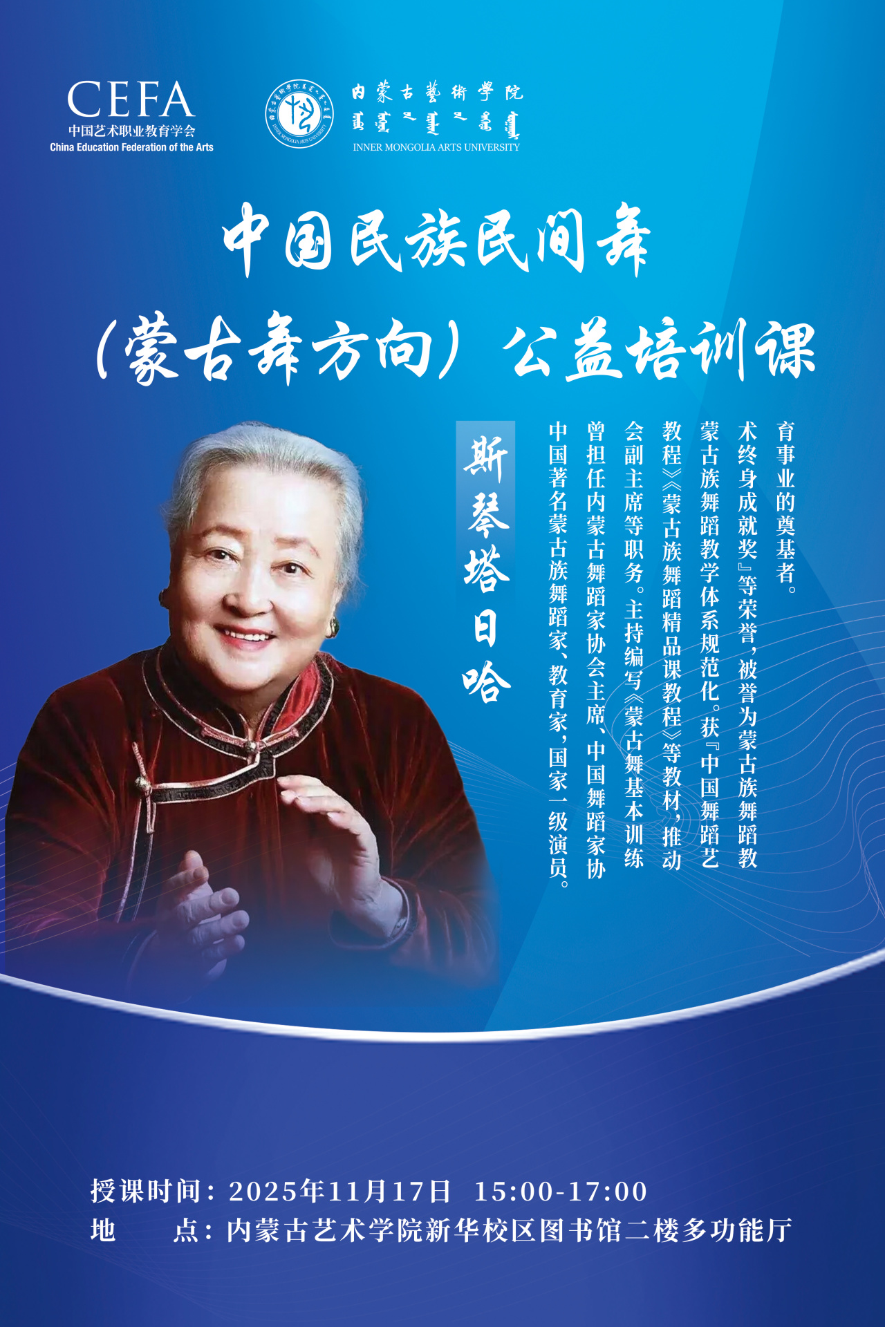 11月17日下午,我校在图书馆二楼多功能厅举办中国民族民间舞(蒙古舞方向)公益培训课。本次课程特别邀请到中国著名蒙古族舞蹈家、教育家斯琴塔日哈教授亲临主讲,为现场参训的“中睿杯”全国中等艺术学校青年教师教学能力比赛参赛选手们带来了一场兼具专业性与指导性的专题讲座。