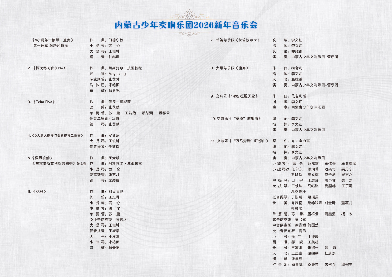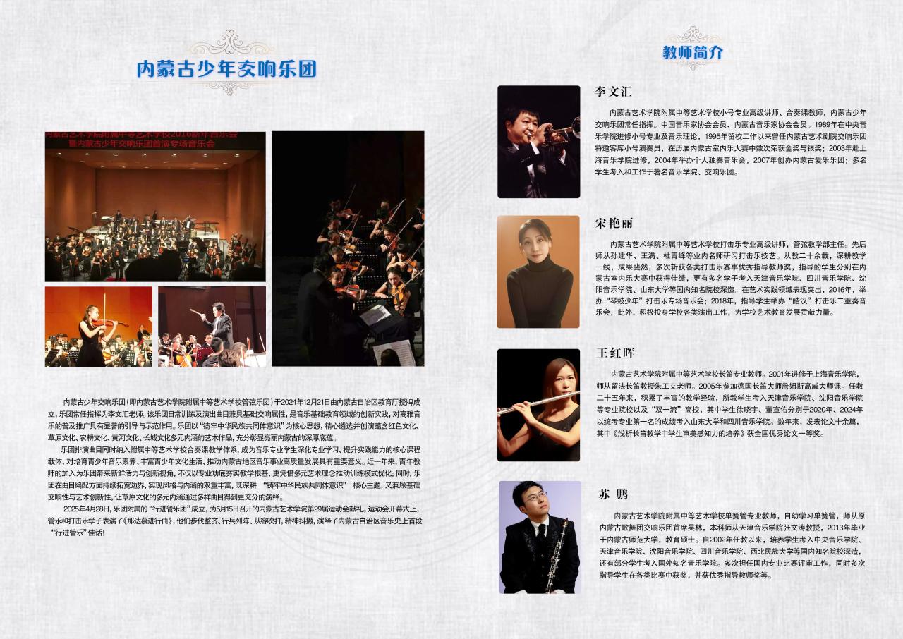 内蒙古少年交响乐团(内蒙古艺术学院附属中等艺术学校管弦乐团)于2024年12月21日由自治区教育厅授牌成立,常任指挥为我校李文汇副教授,本次演出主体由我校青年教师与学生共同组成。乐团以铸牢中华民族共同体意识为主线,精选涵盖红色文化、草原文化、农耕文化等多元内涵的曲目,作为附中合奏课核心教学载体,助力学生深化专业学习、提升实践能力,为内蒙古地区音乐事业高质量发展注入鲜活动力。成立近一年来,青年教师队伍带来创新视角与专业积淀,曲目编配持续拓宽边界,实现教学实效与艺术创新的双重提升。