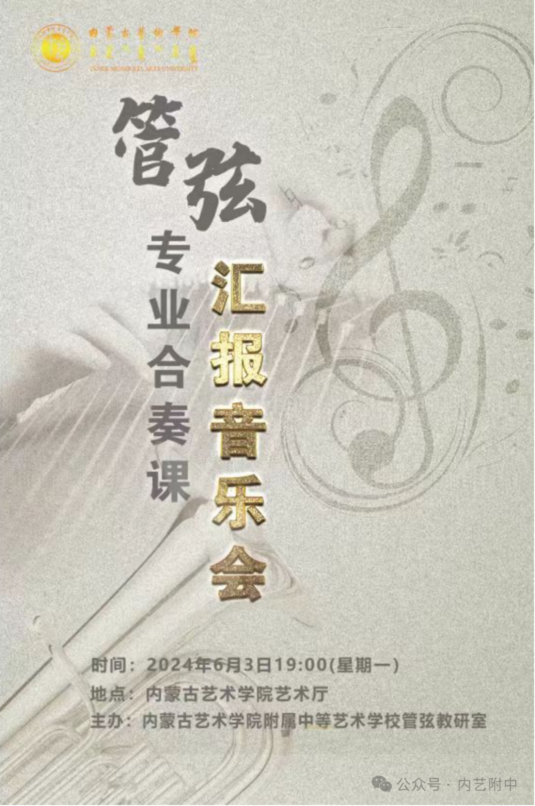 2024年6月3日晚7点,“管弦专业合奏课汇报音乐会”在学院艺术厅举行。我校党总支副书记、校长布仁白乙,党总支副书记、副校长娅茹和管弦教研室全体师生观看了本场音乐会。 本场音乐会的演奏者是我校不同年级的管弦专业学生,由我校少年交响乐团室内乐弦乐团演奏《四季·秋》《山丹丹开花红艳艳》、大提琴二重奏《G大调双大提琴奏鸣曲》第一、二乐章、小号与大号二重奏《名曲旋律三首》、打击乐二重奏《2+1》、低音提琴与大号二重奏《G大调双大提琴奏鸣曲》第三乐章、单簧管二重奏OP.70、小提琴二重奏巴赫《双小提琴协奏曲》第一乐章、长笛二重奏《主题与变奏》《雀鸟》、打击乐二重奏《The Last Dance》、中提琴二重奏《惊愕交响曲》第二乐章短板、铜管五重奏《序曲》、萨克斯四重奏《哈尔的移动城堡联奏》《闲聊波尔卡》、弦乐六重奏《船歌》。