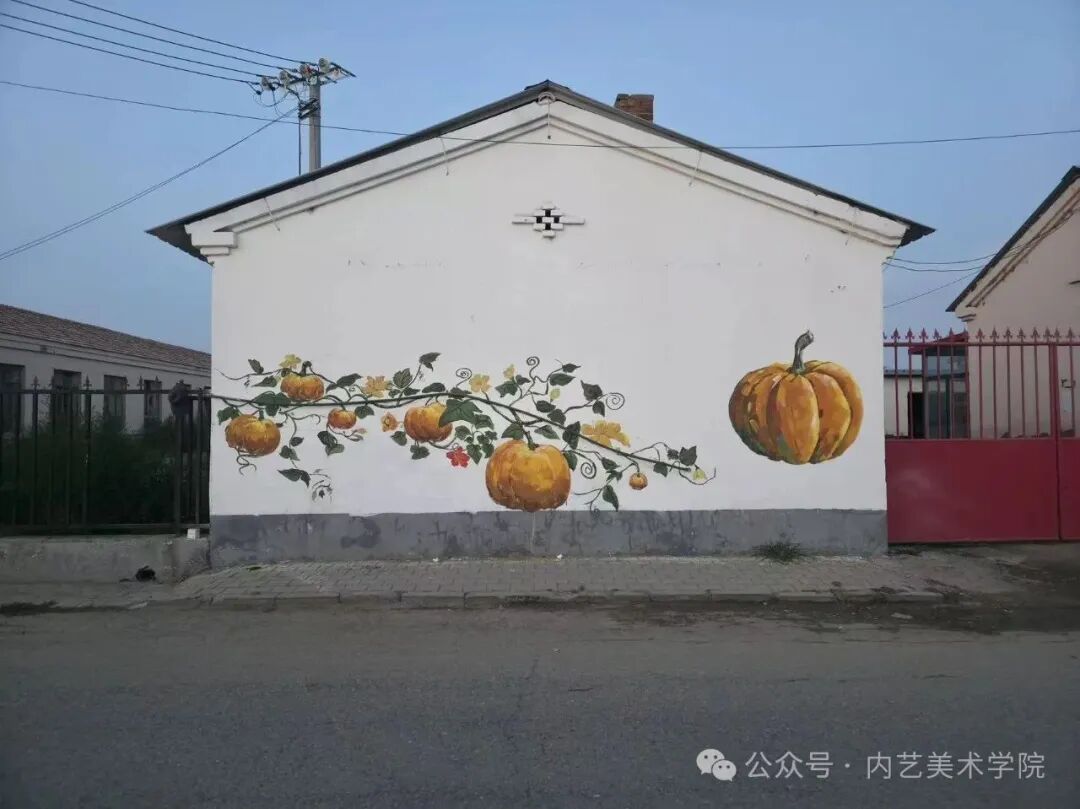 骄阳似火,难掩青春热情。乡村振兴促进团成员们不畏酷暑,以墙面为卷,以汗水为墨,全身心投入创作。近年来,当地积极响应乡村振兴战略,大力扶持特色农产品种植。贝贝南瓜作为内蒙古鄂尔多斯恩格贝镇著名农作物,果型具有软糯香甜的特点,肉质紧密,口感粉糯,味道香甜。2020年底,以恩格贝镇贝贝南瓜为代表的“达拉特南瓜”被农业农村部纳入“全国名特优新农产品”名录。贝贝南瓜通过规模化、专业化的种植,带动了农民增收致富,让乡村焕发出新的活力。美术学院乡村振兴促进团在了解本地特色农产品后,设计出了与当地农产品紧密结合的“南瓜墙绘”创作。画面中藤蔓轻展,翠叶相依,南瓜小巧圆润,色泽诱人。黄花点点,似于时光里轻绽。寥寥笔触,绘出田园清韵,也映出当地贝贝南瓜种植产业的蓬勃生机。同时更是对乡村特色产业振兴政策的生动诠释。
