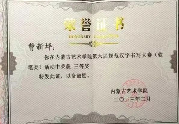 2023年2月,荣获内蒙古艺术学院第六届规范汉字书写大赛(软笔类)三等奖;