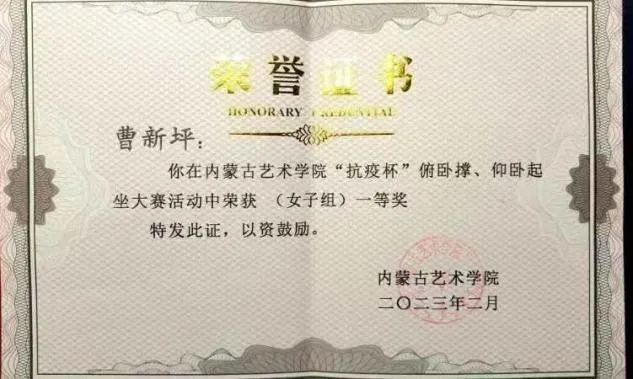 2023年2月荣获内蒙古艺术学院“抗疫杯”俯卧撑、仰卧起坐大赛(女子组)一等奖;