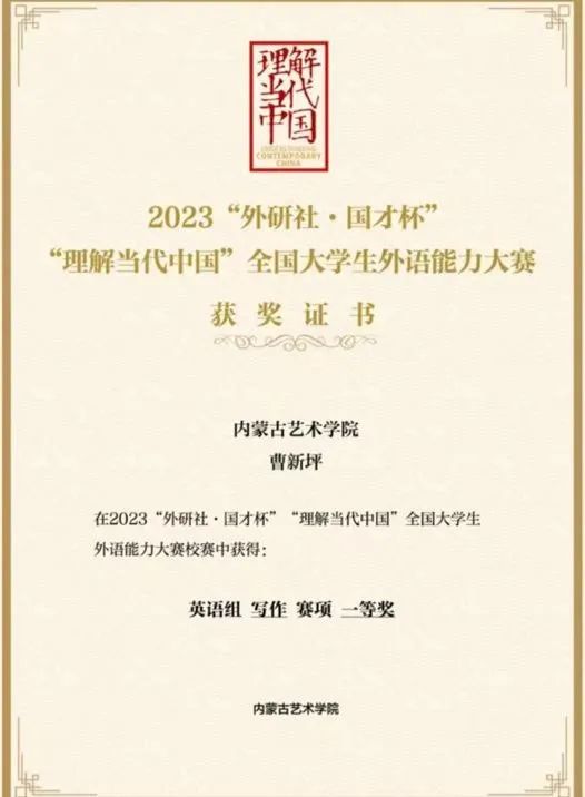 2023年10月,荣获“外研社·国才杯”理解当代中国全国大学生外语能力大赛写作组第一名;