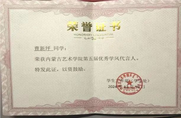 2024年12月,荣获内蒙古艺术学院“学风代言人”称号;