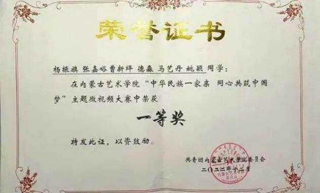 2023年2月,荣获内蒙古艺术学院“中华民族一家亲 同心共筑中国梦”主题微视频大赛中荣获一等奖;