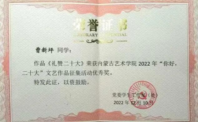 2022年12月,荣获内蒙古艺术学院2022年“你好二十大”文艺作品征集活动优秀奖。