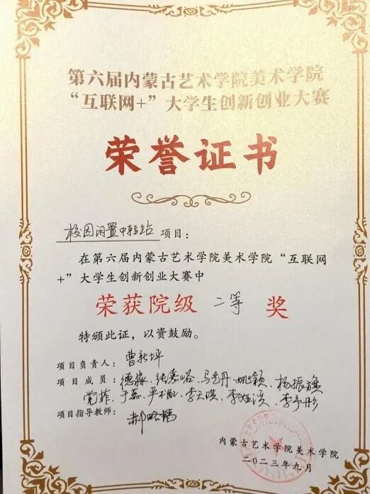 2023年9月,荣获美术学院“互联网+”大学生创新创业大赛二等奖;