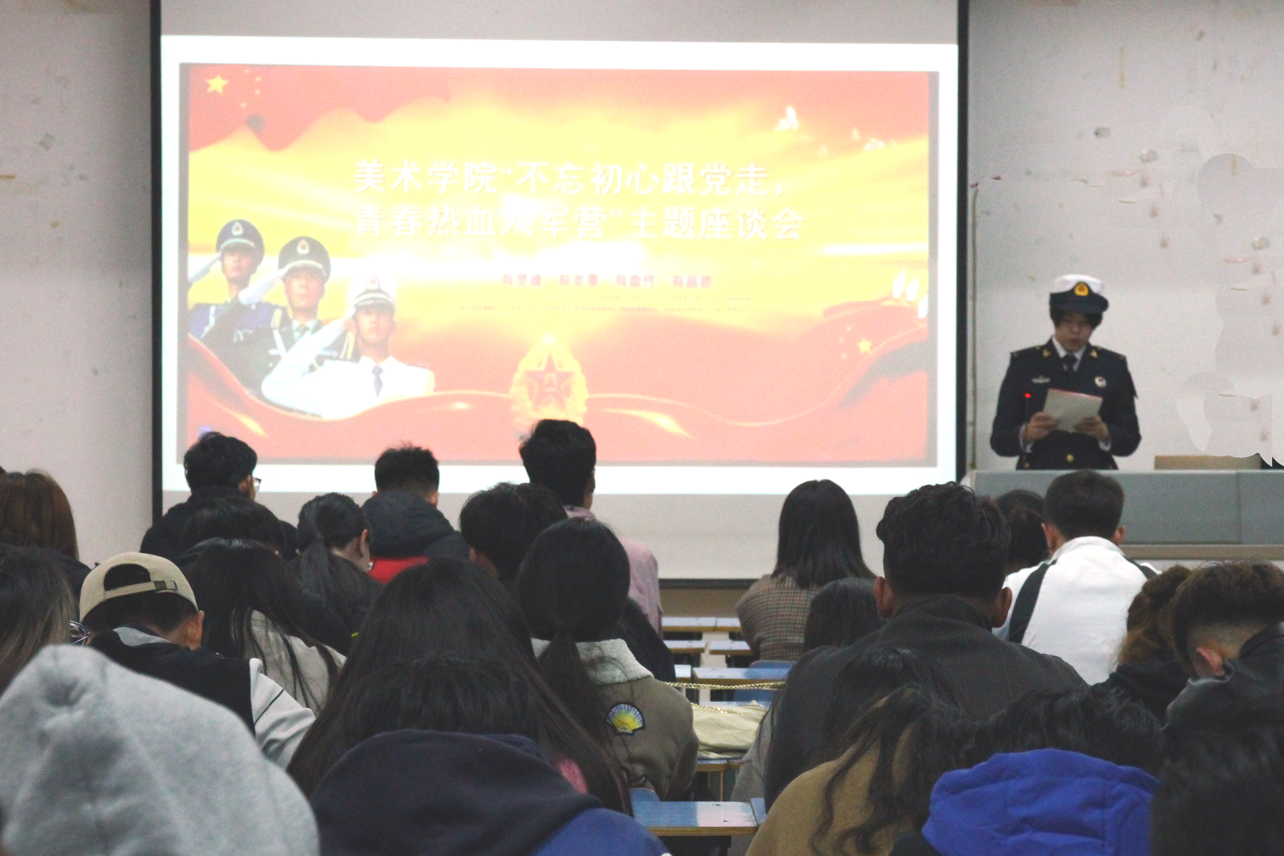 为弘扬爱国主义精神,普及国防教育,使我院青年学生增强国防观念,掌握必要的国防知识和军事技能,10月31日,美术学院开展“不忘初心跟党走,青春热血入军营”主题座谈会。 此次座谈会邀请了我院2016级美术学专业柳少峰、2016级国画专业天星、2017级国画专业张倩等三名退伍军人与大家交流了各自军营生活的心得体会。