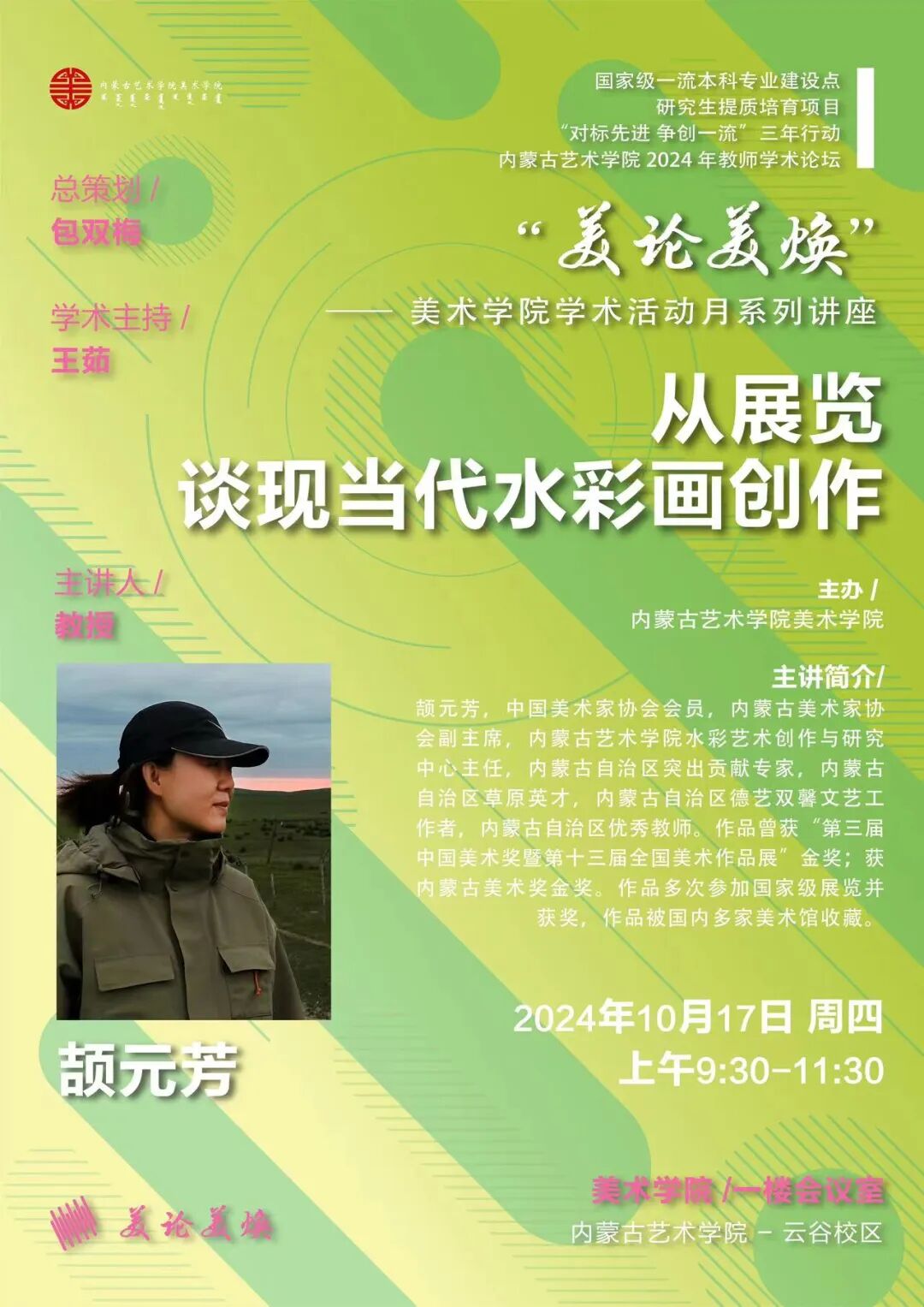 2024年10月17日上午,内蒙古艺术学院美术学院教授、硕士研究生导师颉元芳教授在美术学院一楼会议室举办《从展览谈当代水彩画创作》专题讲座,美术学院水彩专业本科生研究生参加了此次学术讲座。本次讲座由美术学院院长包双梅主持。