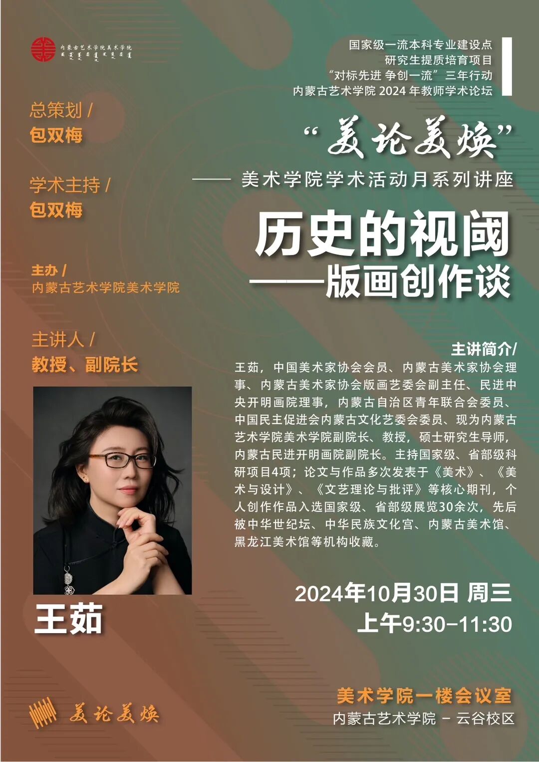 为全方位提高我院师生在艺术创作与科学研究领域的能力,促进国家级一流本科专业建设点——绘画专业的建设进程,实施研究生提质培育项目及“对标先进、争创一流”三年行动计划。特举办“美论美焕”美术学院学术活动月系列讲座,旨在深化学术交流,激发创新活力,凝聚科研力量,促进我院教育事业高质量发展。2024年10月30日,王茹教授在云谷校区美术学院一楼会议室举办了题为《历史的视域——版画创作谈》的专题讲座。讲座由美术学院院长包双梅主持,我院版画系全体研究生和本科生参加了此次讲座。