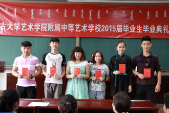 学校领导为毕业生代表颁发了毕业证书。随后,附属中专校长侯守智在毕业典礼上发表了讲话。他首先向圆满完成学业的全体毕业生表示热烈的祝贺!向辛勤育人的老师们表示衷心的感谢!在讲话中侯校长指出“2015届毕业生,在内蒙古艺术学校的发展历史上是具有特殊意义的一个群体。这届毕业生是艺术学校适应新形势调整办学思路后的第一届毕业生,是从2014年9月份开始,在学校‘强化优势、补齐短板’措施引导下,同学们在文化课和专业课两个领域努力学习刻苦专研,比普通中学生付出了更多辛苦和汗水,在刚刚结束的高考中,尽管同学们的许多人还没有取得令自己满意的成绩,但总体而言,这届毕业生的上线率,已经远远超过上一届,这样的成绩取得,说明学校已经引导同学们走上一条正确的成长道路”。侯校长对即将走出校门的同学们送上三句临别的叮嘱:第一,要有远大的志向,同学们的人生之路才刚刚起出,一定要有一座明亮灯塔指引,你们的航船才能乘风破浪,精彩纷呈;第二,要终身学习,无论是即将走进大学的同学还是为大学梦继续拼搏的同学,还是直接参加工作的同学,学习都是摆在你们面前的一个重要课题;第三,做人,做事都要有底线,人的一生是需要不断的历练,不断的思考,才能形成真正属于自己的人生观价值观。