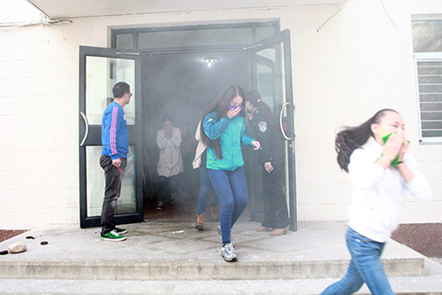 学生公寓1号楼、5号楼进行了模拟火灾现场逃生演练,在逃生演练集合地点,学校操场指导学生使用干粉灭火器灭火的方法,通过乌兰教官生动的讲解及火场现场演练,师生们大家对火灾的危害性也有了直观的深刻的了解,对珍爱生命,预防火灾应警钟长鸣,有了清醒的认识。