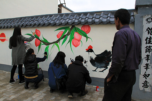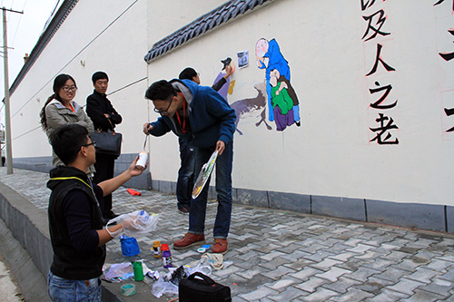 艺术设计系志愿者向新胜村村委会文化活动室捐赠了图书200余册。随后,志愿者在村委会负责人的带领下,在街道两旁墙体上进行手绘,共完成了5面墙的绘制。经同学们手绘后的街道院墙原貌焕然一新,成为了新胜村街道亮丽的风景线,为新胜村“十个全覆盖”工程增添了新的气象。