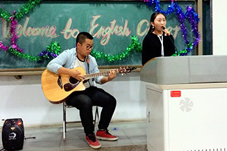 在主持人流利的英语开场词之后,欢快的女生小合唱《每个人》(Everybody)拉开了活动的序幕。随后同学们表演的节目精彩纷呈,有动听的英文歌曲《在我肩上哭泣》(Cry on My Shoulder)、《宝贝》(Baby)、《爱情故事》(Love Story)、《天空之城》(Castle in the Sky),有师生合作的歌曲《小故事》(A Little Story),有铿锵有力的《军队进行曲》(Military March),还有吉他弹唱《爱就要行动》(Love Is a Verb)、分声部合唱《柠檬树》(Lemon Tree)和展现自信勇敢的《你要走我的路吗》(Are You Gonna Go My Way),歌声激情洋溢,极富感染力。活动中,同学们还表演了诗朗诵《面朝大海,春暖花开》(Facing the Sea with Blossoms)、《自由》(Freedom)和《创造属于你自己的生活》(Creating Your Own Life),还有同学们自己创编的舞蹈节目和风趣幽默的英汉双语小品《语言障碍》(Language Obstacles)等。演出高潮迭起、掌声阵阵。最后,同学们齐唱欢乐甜美的《大千世界》(Big Big World),活动圆满落幕。在本次英语角活动中,同学们用丰富多彩的表演节目诠释着青春和力量,充分展示了英语风采和青春活力,提高了英语学习的兴趣和英语沟通能力。
