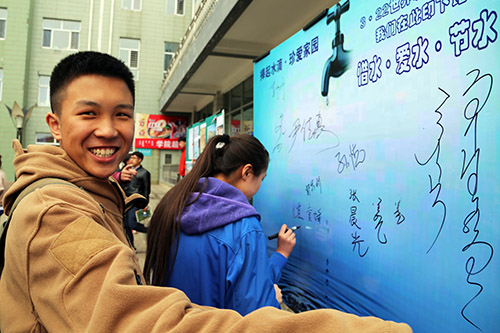 在活动过程中,同学们积极参与,参观陈列在小广场中央有关于节水知识和部分缺水地区情况的展板,留下自己的节水心得和节水小窍门,并且在横幅上签字以表示节水的决心。学联工作人员还在包括学生公寓、食堂、热水房、行政楼和教学楼在内的用水区域张贴节水标语,让节水行动从日常用水中做起。此次活动让更多同学知道节水用水的重要性,提高了大家的爱水、节水意识。
