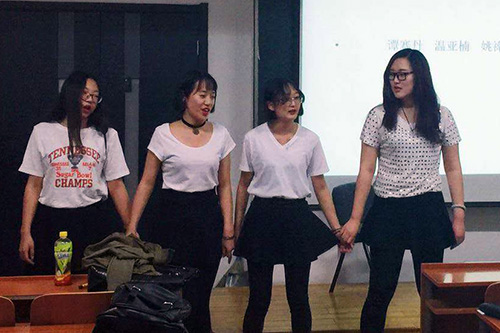 在活动中,同学们演唱了英语歌曲《让一切随缘》(whatever will be)和吉他弹唱《一点爱》(A little love),表演了英语情景剧《小美人鱼》(The Little Mermaid)和英语电影《疯狂原始人》(The Croods)片段配音。期间穿插了英语双关语知识抢答环节,主持人宣读问题,同学们积极抢答,抢答正确者可以获得精美礼品。本次活动还邀请了1位“学霸”与大家分享交流在校本部模拟联合国(MUN) 社团学习活动的经历,使同学们认识到积极参与实践活动和提高英语交流能力的重要性。