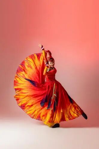 作品简介:鄂温克族舞蹈《燃》以民族世代传承的火文化为灵感,通过火堆造型道具构建出篝火意象,舞者围绕“篝火”展开充满生命力的肢体表达。舞蹈以刚柔并济的动律模拟火焰升腾之姿,展现鄂温克人对温暖与光明的永恒追求。树桩道具的运用既象征自然的馈赠与民族精神的薪火相传,通过热烈的节奏与流畅的韵律,展现鄂温克人与火共生、与自然和谐相处的民族精神,传递温暖、团结与希望的力量。