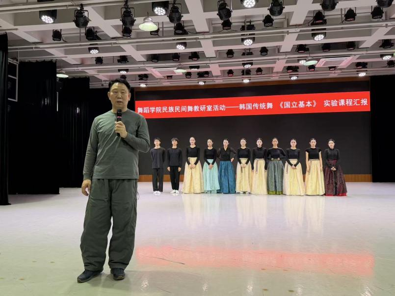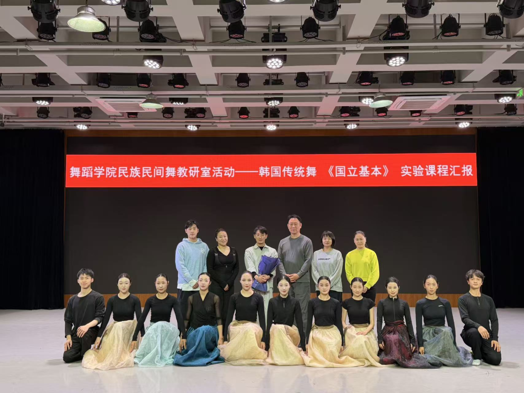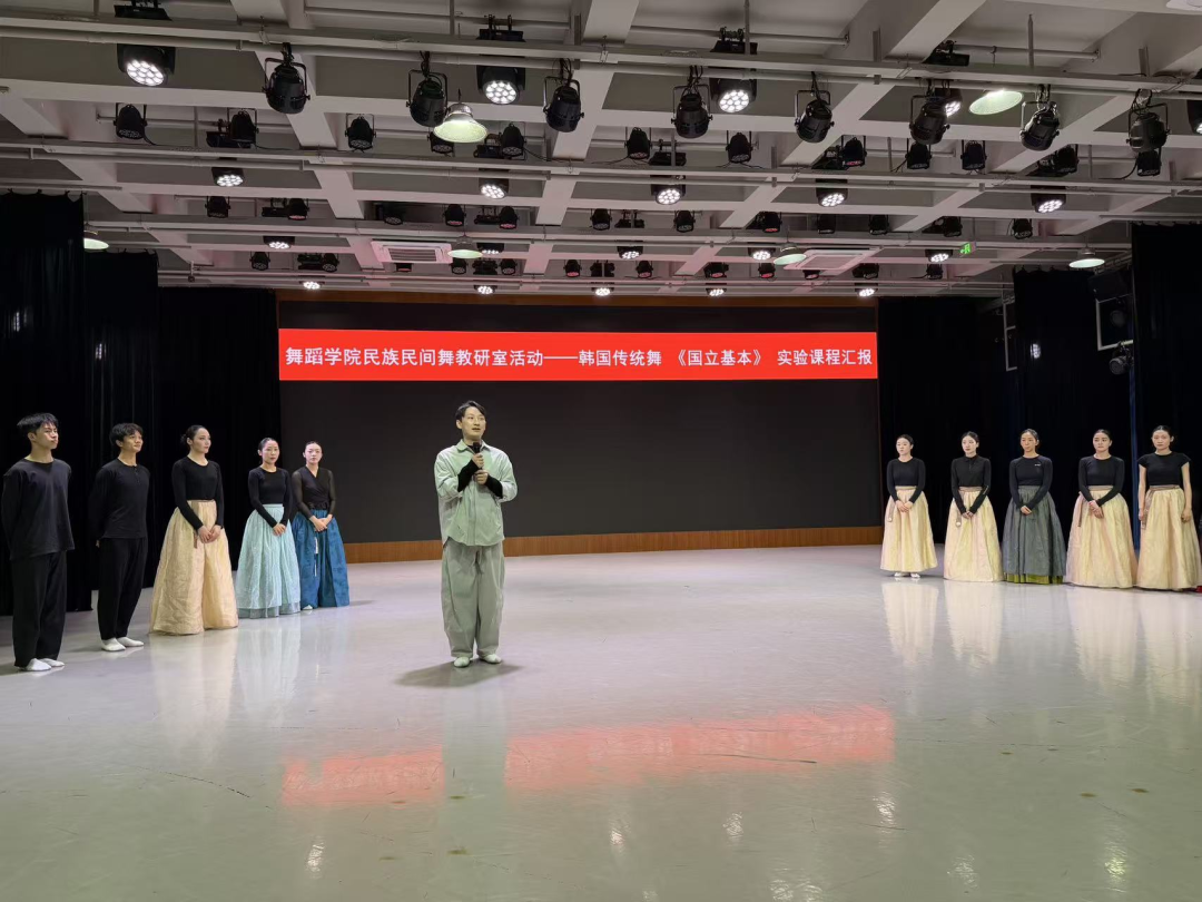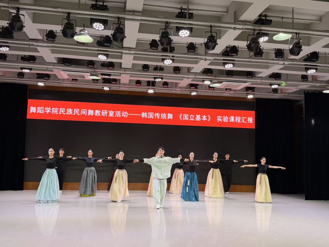2025年12月28日,舞蹈学院民族民间舞教研室主办的韩国传统舞《国立基本》实验课程汇报在学院实训剧场顺利开展。本次课程由艺术学博士、讲师石钦担任授课教师,历经三课时的集中教学,学院研究生与本科生学员同台展示阶段性学习成果,为民族民间舞跨文化教学实践搭建了专业的交流展示平台。