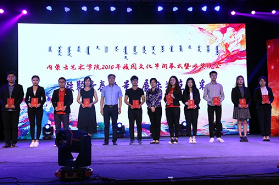 闭幕式晚会现场,颁奖仪式与文艺表演穿插进行,分别表彰了在挑战杯大赛、身边好青年、“四进四信”主题辩论赛、“三走”活动、校园达人秀等活动中表现突出的团体和个人;师生们还表演了舞蹈《汗沁·贝勒格》、朗诵《破晓的曙光》等精彩的节目。