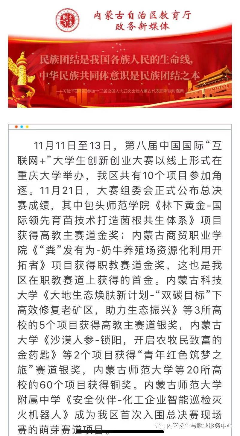我校今年在全国大学生创业服务网上的报名数达到了309项,参与学生突破了1500名,参与指导教师近200位。首次组织学生参加了产业赛道报名,对接2个企业,共获批20个推荐区赛网评指标,包括高教主赛道11项,红旅赛道7项,职教赛道1项,产业命题赛道1项。我校在8月中旬结束的自治区“互联网+”大赛决赛中获得银奖3项、铜奖3项,1项银奖推荐国赛网评,并获国赛铜奖。2022年我校的“互联网+”大赛报名数、推荐区赛网评数、区赛获奖数均创历史新高。