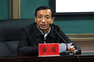左图:自治区十八届五中全会宣讲团成员、自治区社科联副主席胡益华作专题讲座;右图:我院党委书记黄海主持会议