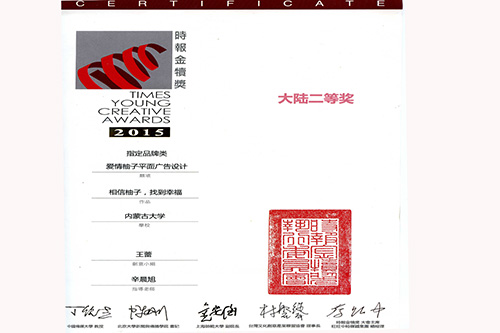 在本年度比赛中,我院艺术设计系喜获佳绩。其中荣获“时报金犊奖”奖项的有:辛晨旭老师指导的2013级视觉传达设计专业的学生王蕾获得指定品牌类“大陆二等奖”;孙欢获“优秀奖”。荣获“中国大学生广告艺术节学院奖毕业设计大赛”奖项的有:苑秀明老师指导的2012级服装与服饰设计专业的学生图雅获得产品类“铜奖”,李纳获得产品类“佳作奖”;辛晨旭老师指导的2012级视觉传达设计专业的学生乔涵获得视觉类“佳作奖”;王智睿老师指导的2012级环境设计专业的学生郝凯丽、李家研获得环境类“佳作奖”;王巍老师指导的2012级视觉传达设计专业的学生袁继红获得视觉类“佳作奖”。荣获“第十三届中国大学生广告艺术节学院奖”的有:辛晨旭老师指导的2013级视觉传达设计专业的学生周英杰、王蕾获得手机摄影作品“佳作奖”;郑涛、温平平、贺静、车力很获得平面广告“优秀奖”;丁瑞婕、孙睿、董雪飞、李鑫、马湘琴、贾兴宇获得平面广告“佳作奖”。同时,辛晨旭老师荣获中国大学生广告艺术节学院奖“优秀指导教师”称号。