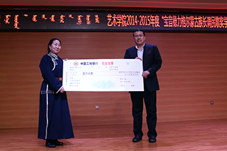 会上,黄海书记宣读了《关于表彰内蒙古大学艺术学院2014—2015学年度“宝音德力格尔蒙古族长调民歌奖学金”获得者的决定》。我院研究生、音乐学院和附属中专蒙古族长调民歌专业的10名学生获得“宝音德力格尔蒙古族长调民歌奖学金”,每人奖金2000元。获奖学生娜荷芽作为学生代表做了发言。宝音德力格尔老师的女儿高娃女士个人出资1万元,汇入“宝音德力格尔蒙古族长调民歌奖学金”,继续资助我院品学兼优的长调专业学生,帮助他们更好地完成学业。