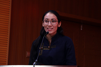 左图:我院党委副书记兼纪委书记毅力主持颁奖仪式;右图:获奖学生代表娜荷芽发言