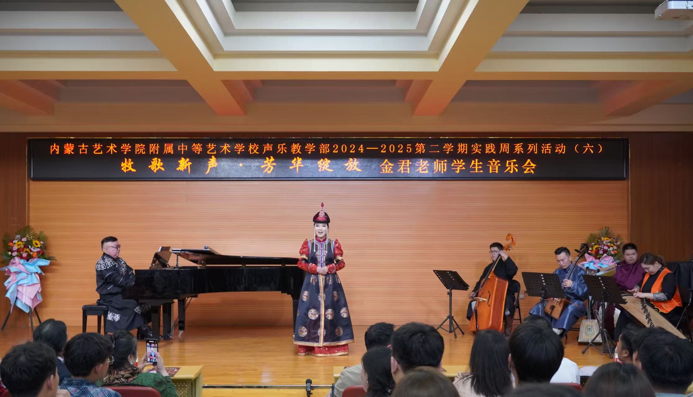 5月27日18:30,我校声乐教学部在艺术厅举办了本学期实践周系列活动第六篇章“牧歌新声·芳华绽放”——金君老师学生音乐会。本场音乐会不仅展示了我校青年教师的教学能力,也充分表现了学生的音乐素养和舞台表现力。光临音乐会的嘉宾有著名长调艺术家扎格达苏荣、查干呼老师;内蒙古师范大学音乐学院副教授斯琴毕力格老师;内蒙古艺术学院非遗学院长调副教授巴鲁、朝克图、孟根苏都、乌云、辛其其格、伊拉图老师,以及我校校领导、声乐教学部全体师生及部分家长一同观看了音乐会。