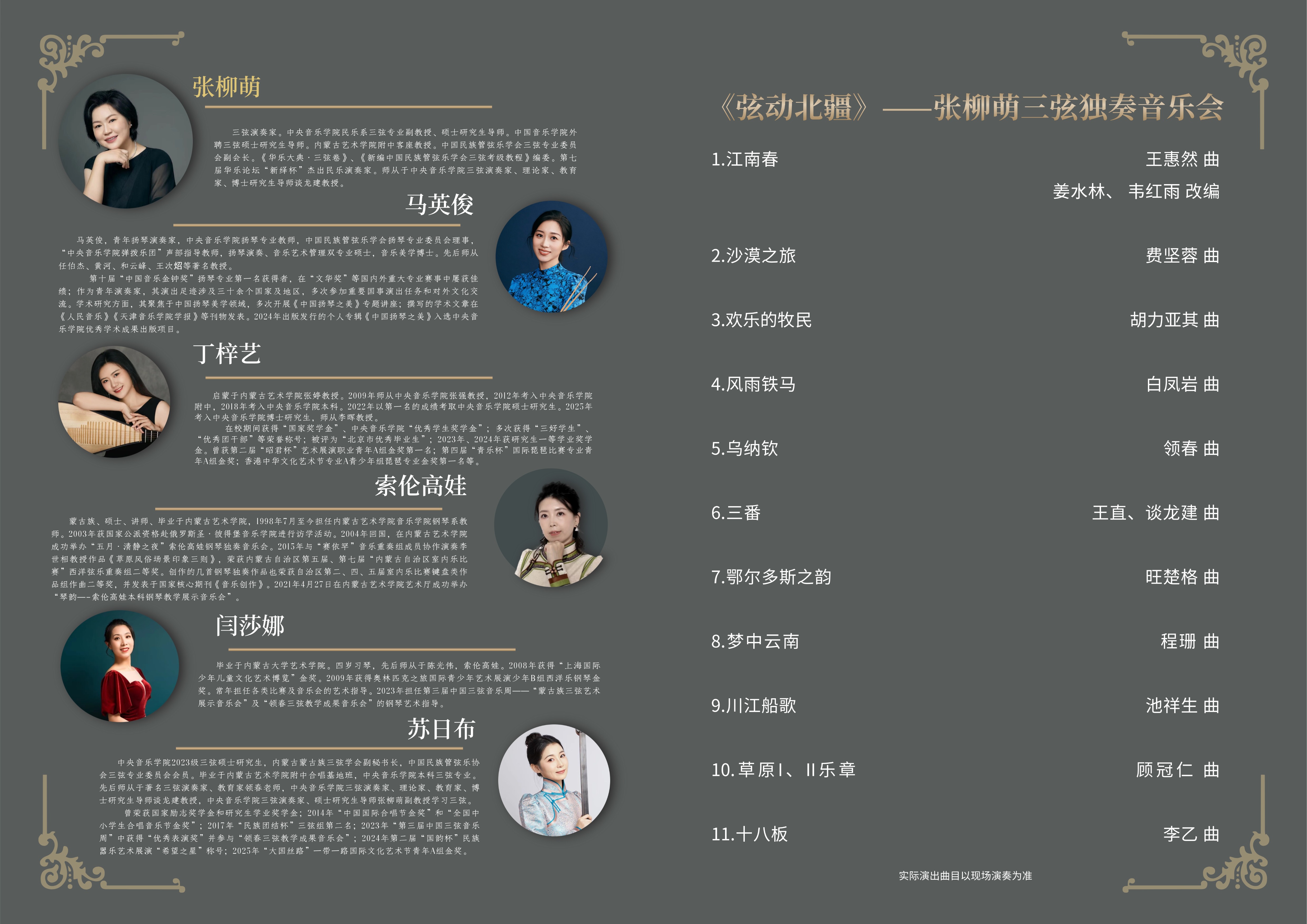音乐会曲目形式多样,蕴含众多地域风格作品,全方位展示三弦艺术的独特魅力。有小桥流水的江南《江南春》;浩瀚无垠的沙漠《沙漠之旅》;万马奔腾的草原《欢乐的牧民》《乌纳钦》《鄂尔多斯之韵》《草原第一第二乐章》;取材于梅花大鼓的《三番》;风情万种的云南《梦中云南》;源自于河南坠子曲的《十八板》等。三弦这种中国传统弹拨乐器在张柳萌老师的手中,俨然成了诉说华夏千年故事的载体,每一曲终了,都引来观众经久不息的掌声。