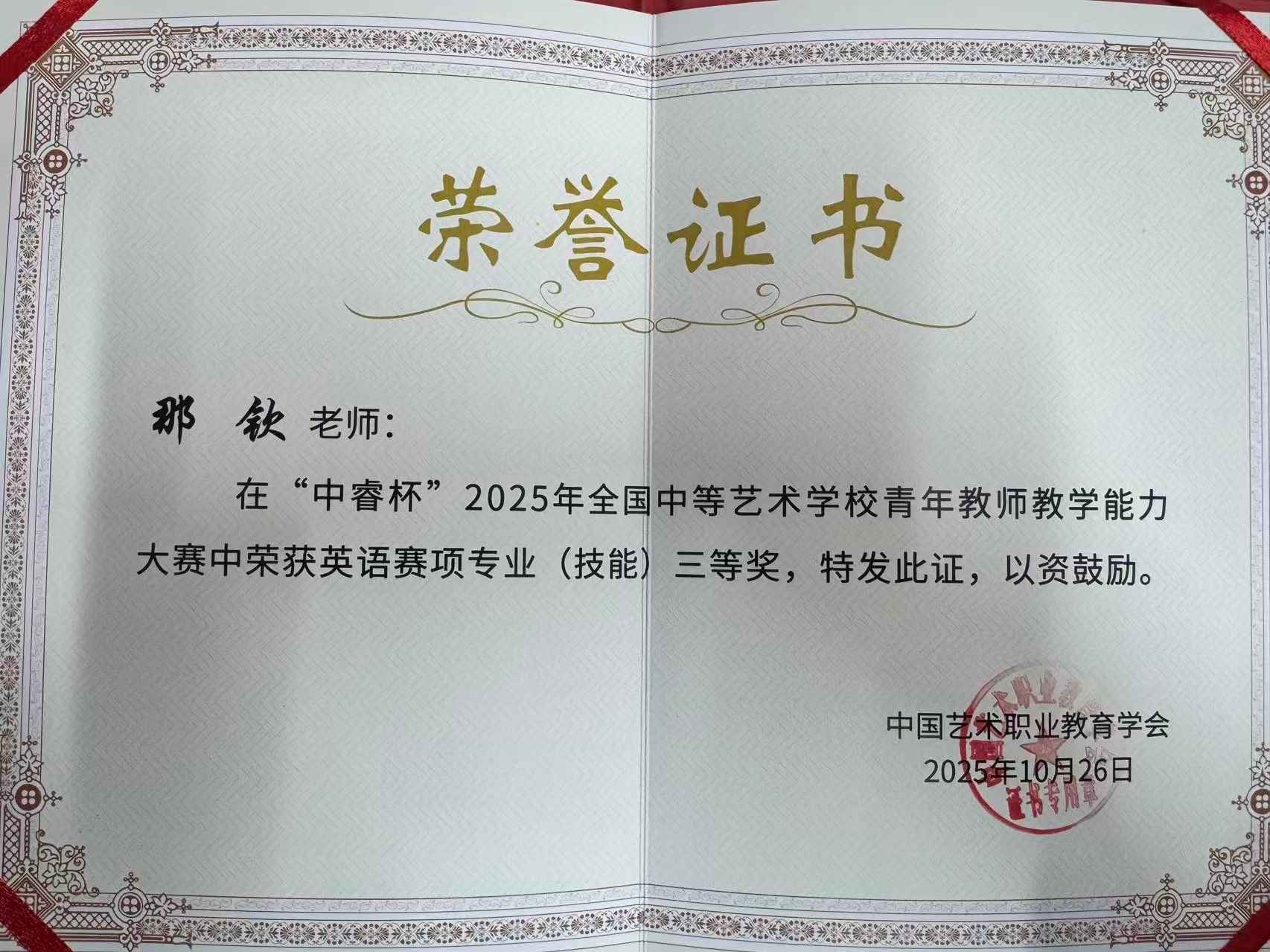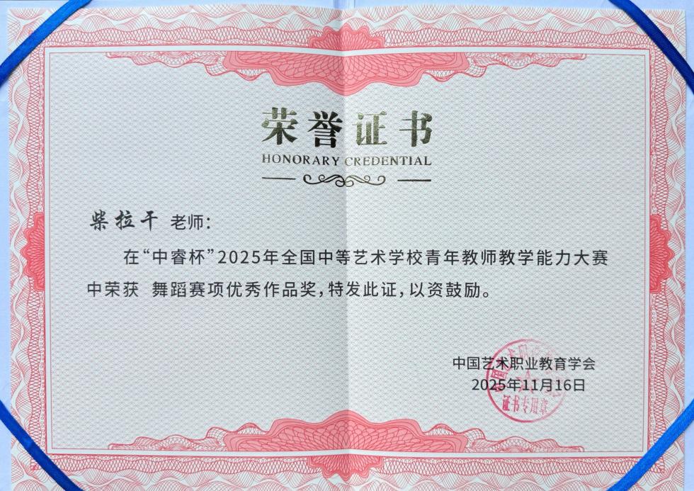 近日,在由中国艺术职业教育学会主办的2025年“中睿杯”全国中等艺术学校青年教师教学能力比赛中,我校选派的三位青年教师凭借出色的表现,喜获佳绩。作为全国中等艺术教育领域的重要赛事,本届“中睿杯”汇聚了30多所中等艺术类学校共计80余名优秀青年教师同台竞技。三位青年教师在此次高水准赛事中的优异表现,充分展现了我校教师队伍的专业素养和教学实力。