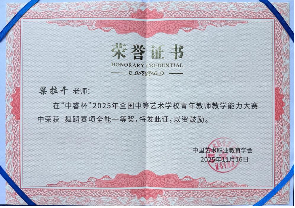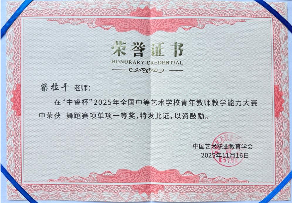在11月15日至16日于我校承办的舞蹈赛项现场决赛中,我校青年教师柴拉干与康冉双双斩获殊荣。蒙古舞教学部青年教师柴拉干凭借精湛的教学技艺、新颖的教学设计和全面的专业能力,荣获单项一等奖、最佳剧目奖及全能一等奖;基本功教学部青年教师康冉则以规范的芭蕾基本功展示和细腻的剧目《绿宝石》西西里变奏,荣获全能三等奖与单项三等奖。两位青年教师的出色表现,从不同层面展现了我校在舞蹈专业教学上的扎实功底与创新活力。