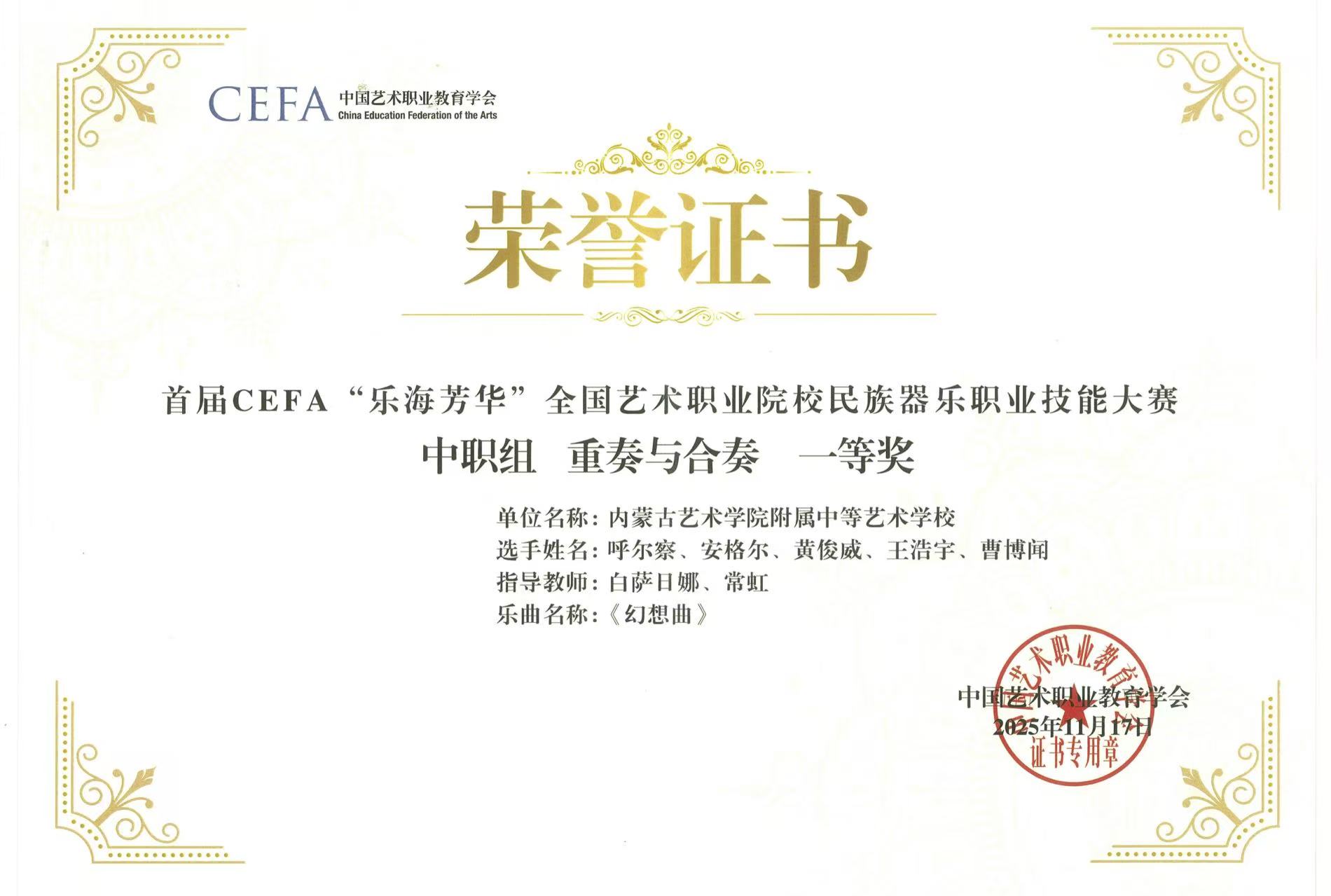 由白萨日娜、常宏两位老师指导的马头琴重奏《幻想曲》以其传统经典的组合形式和独有的民族特色,在全国700余名优秀选手中经过激烈角逐,最终荣获中职组重奏与合奏组“一等奖”,并参加颁奖晚会的演出。