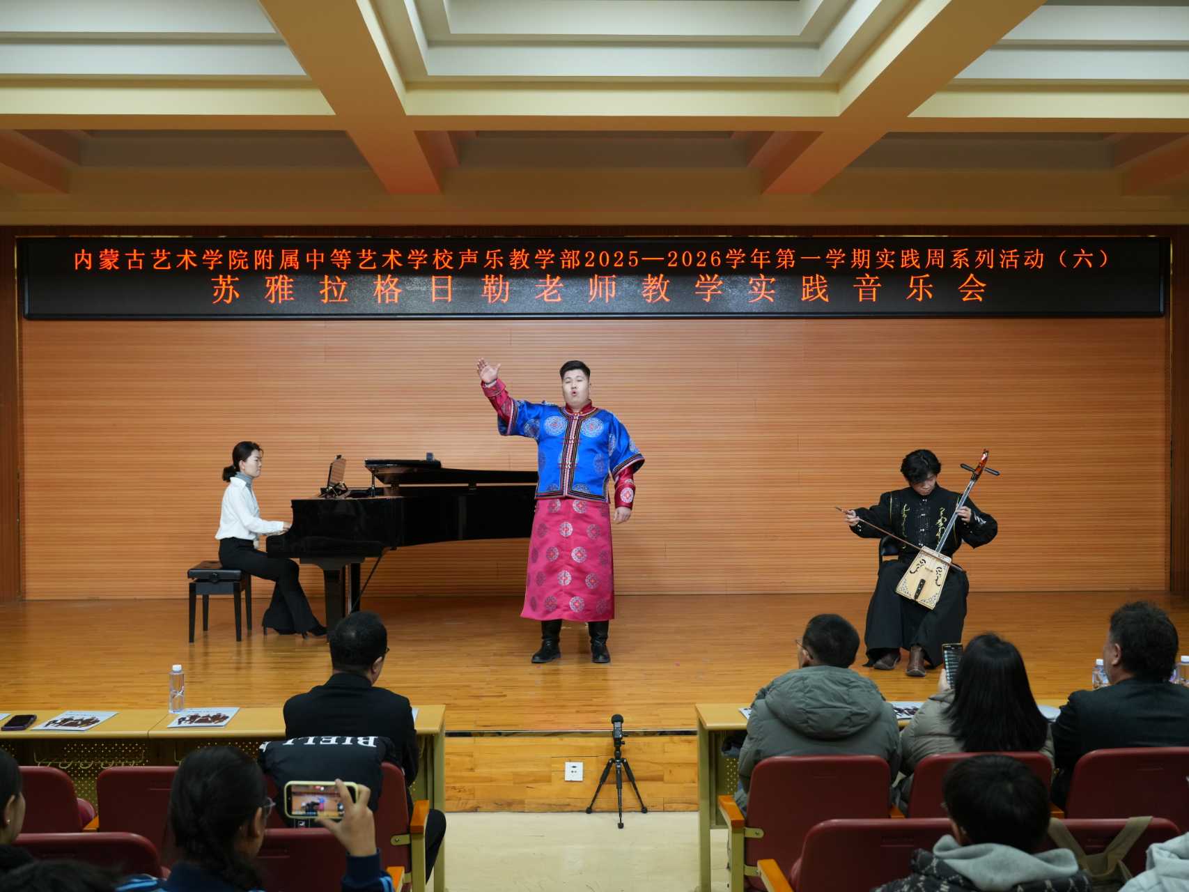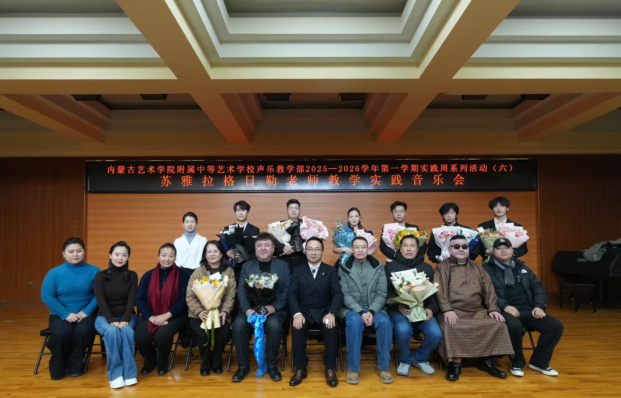为展示声乐教学成果,锤炼学生舞台实践能力,12月2日19:00,附属中等艺术学校声乐教学部2025—2026学年第一学期实践周系列活动(六)——“苏雅拉格日勒老师学生实践音乐会”在艺术厅举办。我校领导班子成员与声乐教学部师生观看了本场音乐会。
