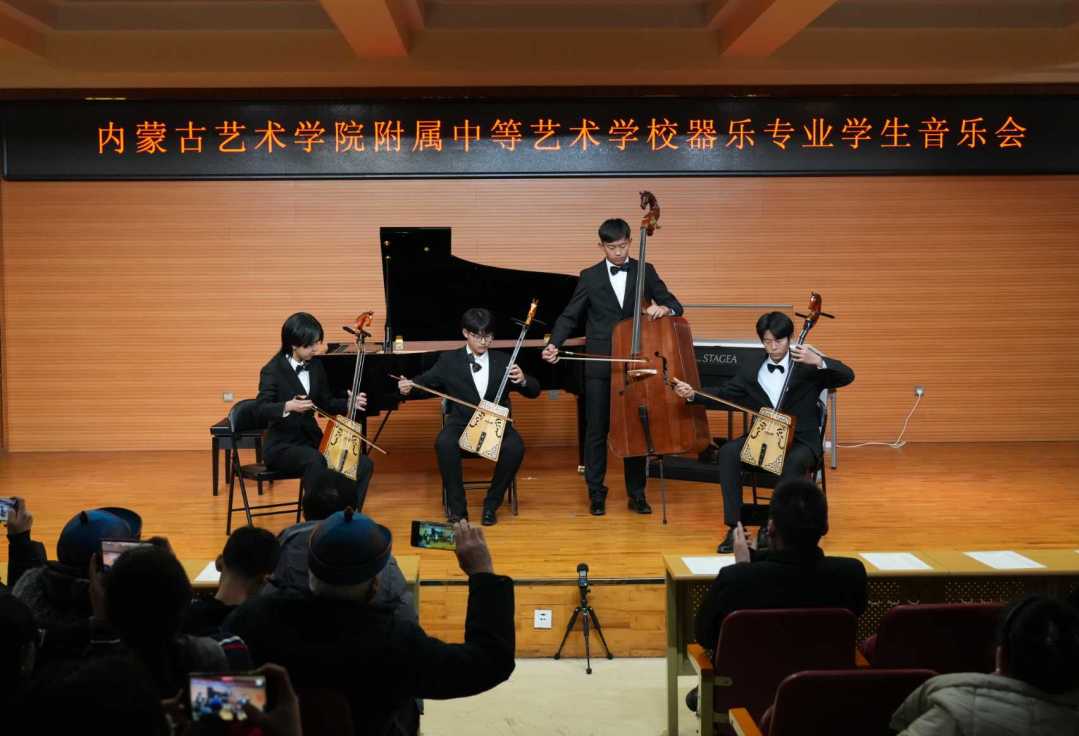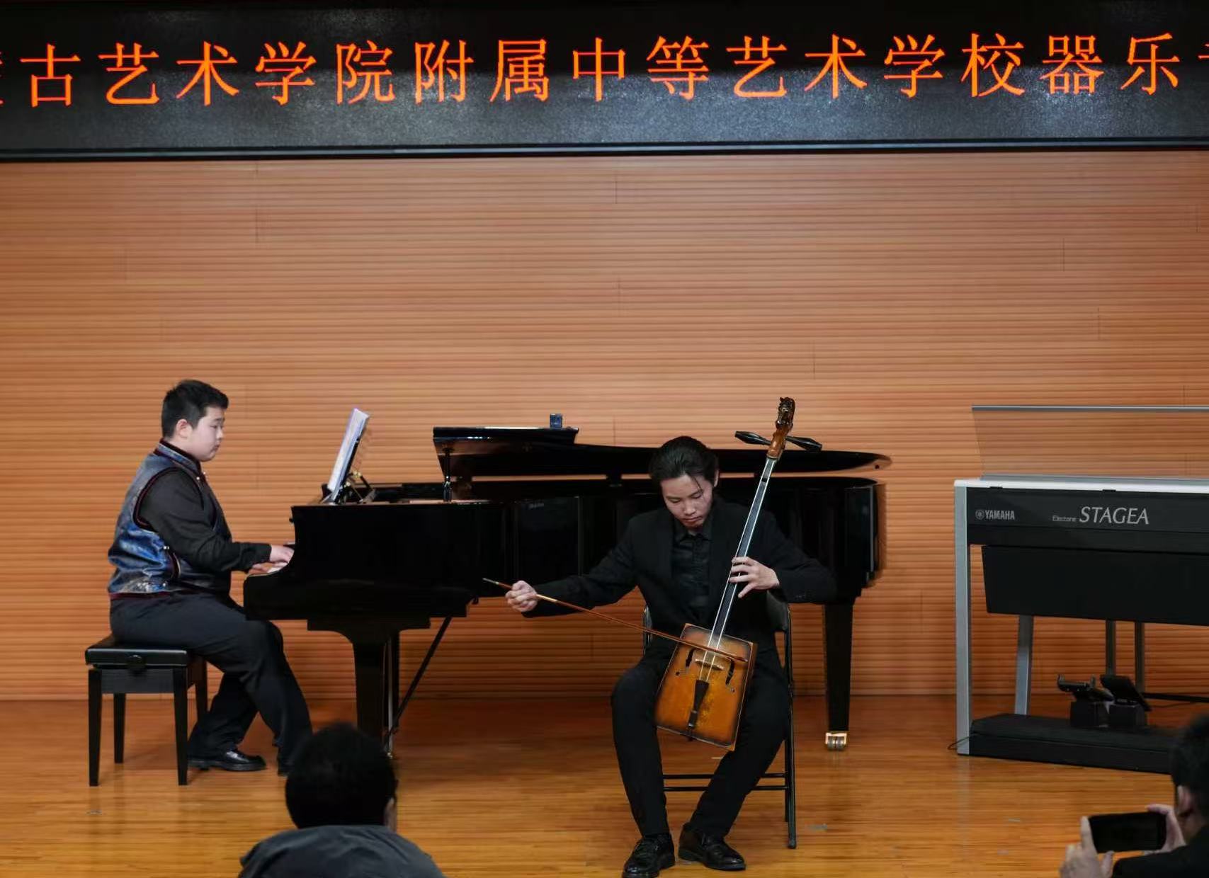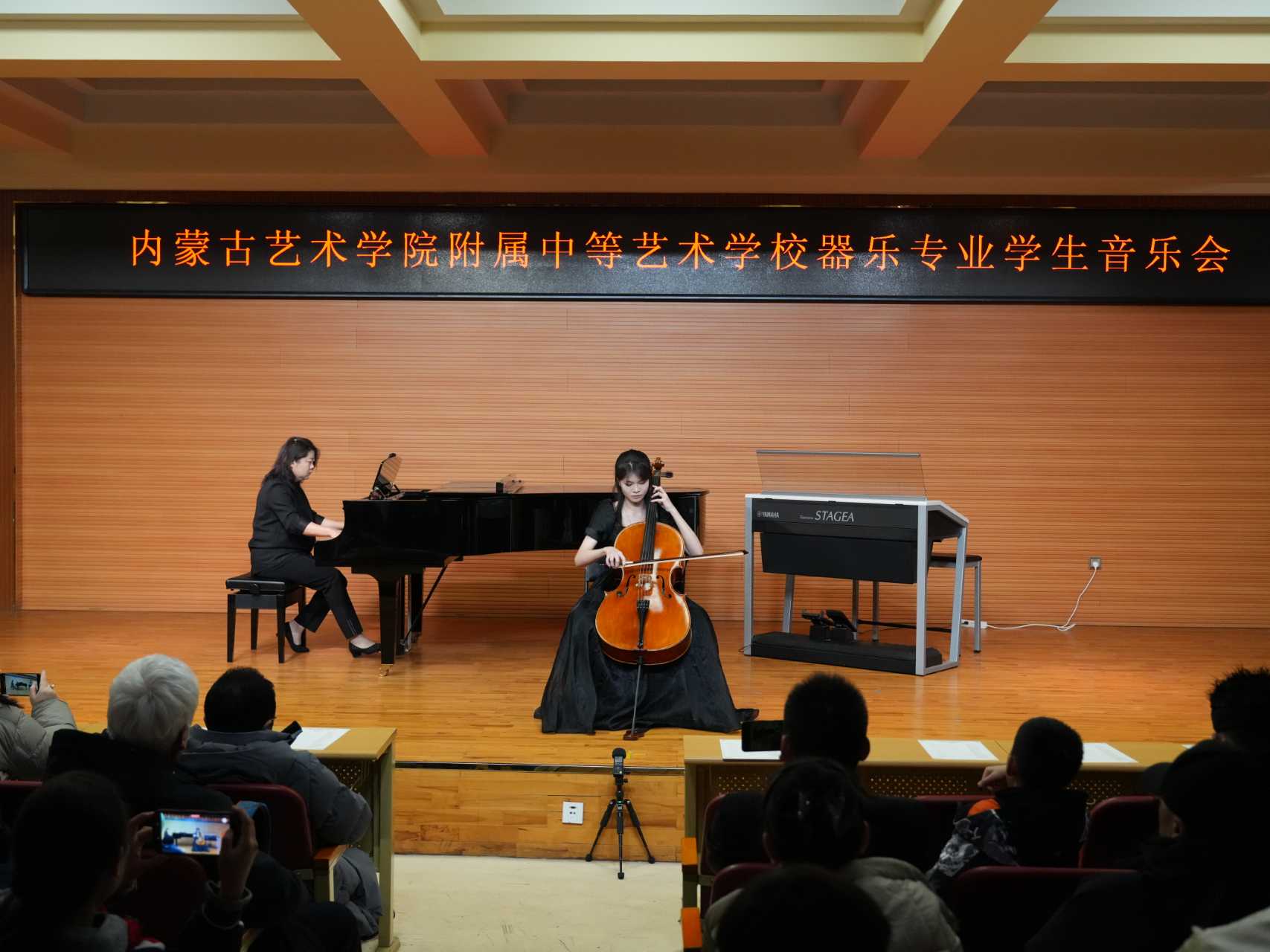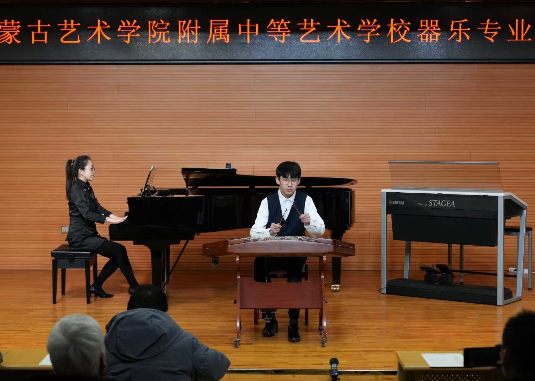 音乐会开场,周书宁同学(高一年级打击乐专业)演奏的马林巴曲《竹林》通过模拟自然的手法,营造出空灵、朴素的音乐意境;任祐缘(初三年级钢琴专业)演奏的车尔尼《练习曲》作品740之36通过变节奏练习强化颗粒感,右手的快速跑动与左手和弦协调配合;王黄熠涵(初三年级小提琴专业)演奏的《第三小提琴协奏曲》音乐语言简洁明快、旋律优美、结构紧凑,具有强烈的戏剧性;满都拉(高二年级马头琴专业)同学演奏的《乌力吉巴雅尔第一马头琴协奏曲》该作品将20世纪作曲技法融入蒙古族传统音乐体裁,演奏时需运用双音、三连音演奏弓法等马头琴特色技巧,音乐情感丰富,兼具传统韵味与现代音乐表达;马钰淇同学(初三年级大提琴专业)的大提琴独奏《a小调协奏曲》旋律悠长、音乐明快、和声色彩丰富、节奏变化复杂,情绪起伏强烈;王志杰(初三年级扬琴专业)演奏的扬琴曲《云端》灵活运用滑音、颤音、击弦和拨弦等技巧增强了旋律的流畅性和音色的层次感;乌日汗(初二年级钢琴专业)演奏的库劳《A大调小奏鸣曲》第一乐章将古典奏鸣曲的作品风格体现的恰到好处;马头琴四重奏《齐勒贡》运用三把马头琴与一把低音大马头琴,以重奏的形式拓展草原音乐的表现力,既保留马头琴特有的苍茫与深情,又注入了现代编曲的层次与张力;梁书然(初三年级萨克斯专业)的萨克斯管独奏《奏鸣曲》采用三连音、十六分音符和附点音符交替进行的形式,克莱斯顿大量运用反拍重音技巧和变音记号,演奏技术难度较大;安格尔(初三年级双排键专业)演奏的电子管风琴曲《走西口》以山西民歌旋律为基础,描绘了黄土高原上人们背井离乡的离别情感。