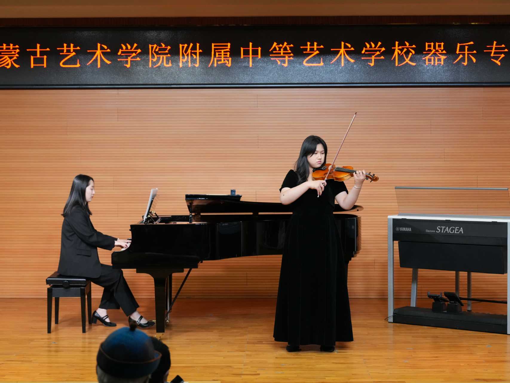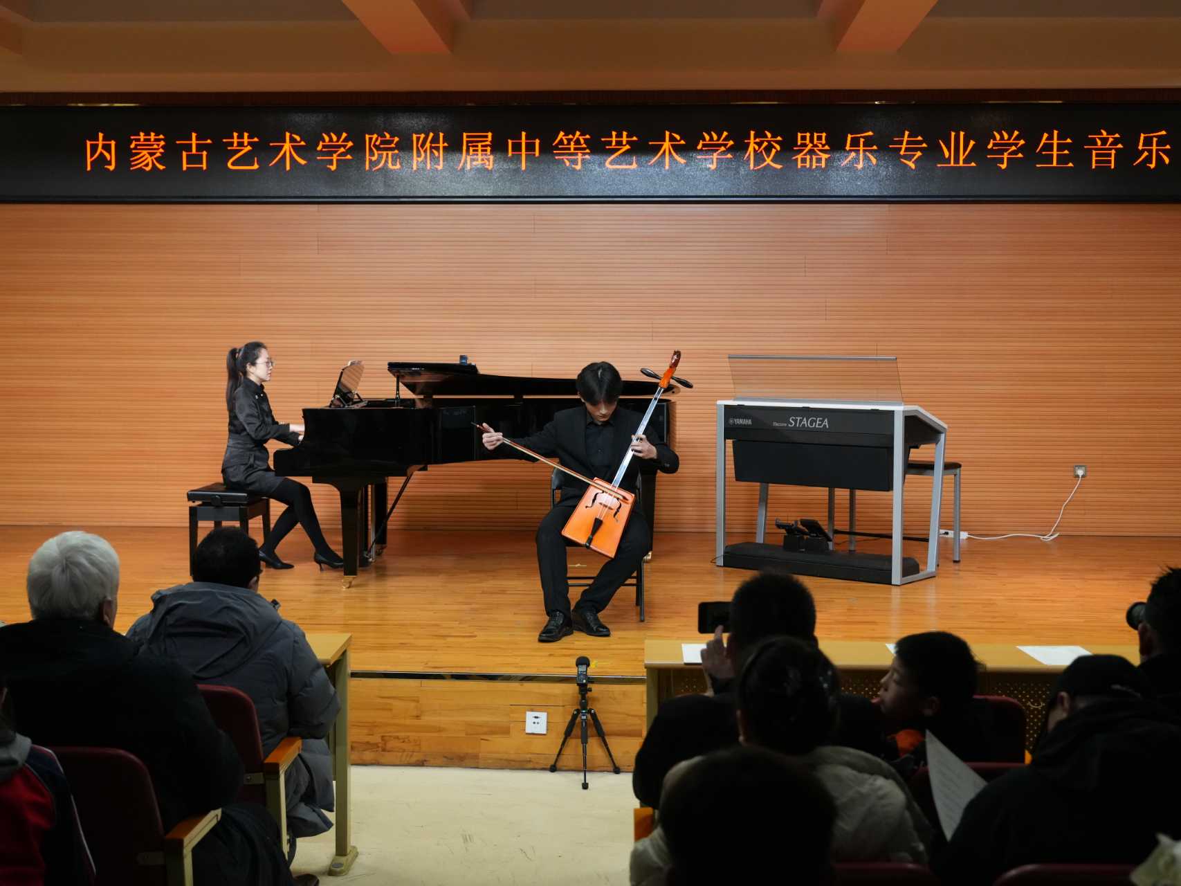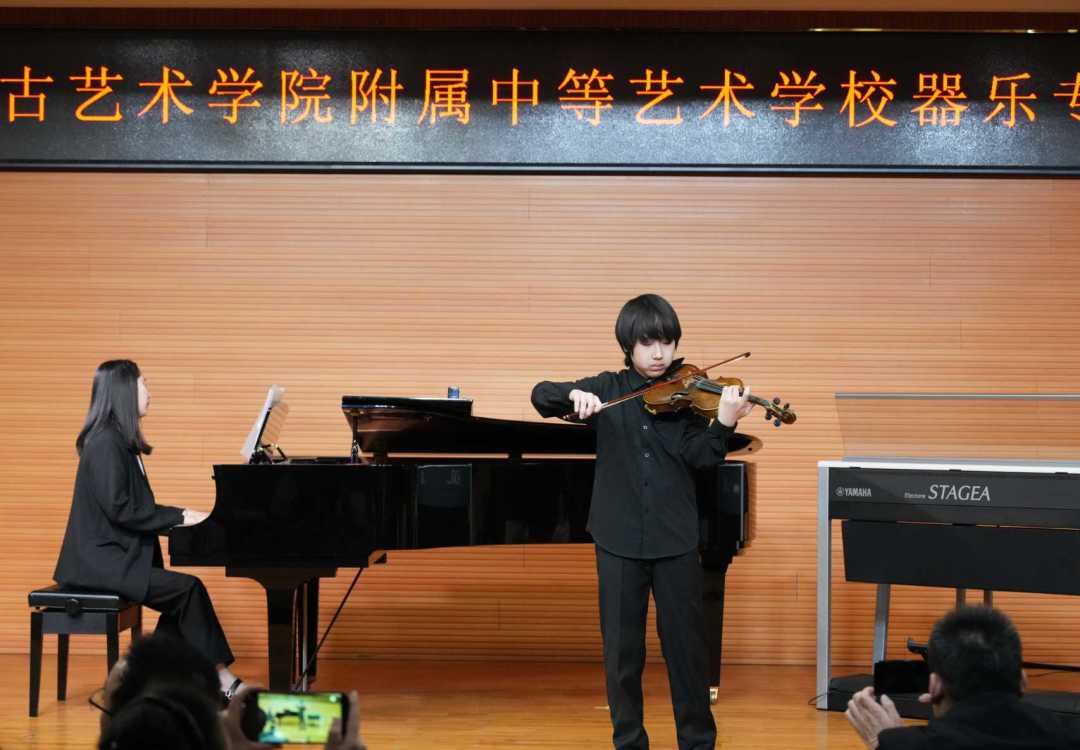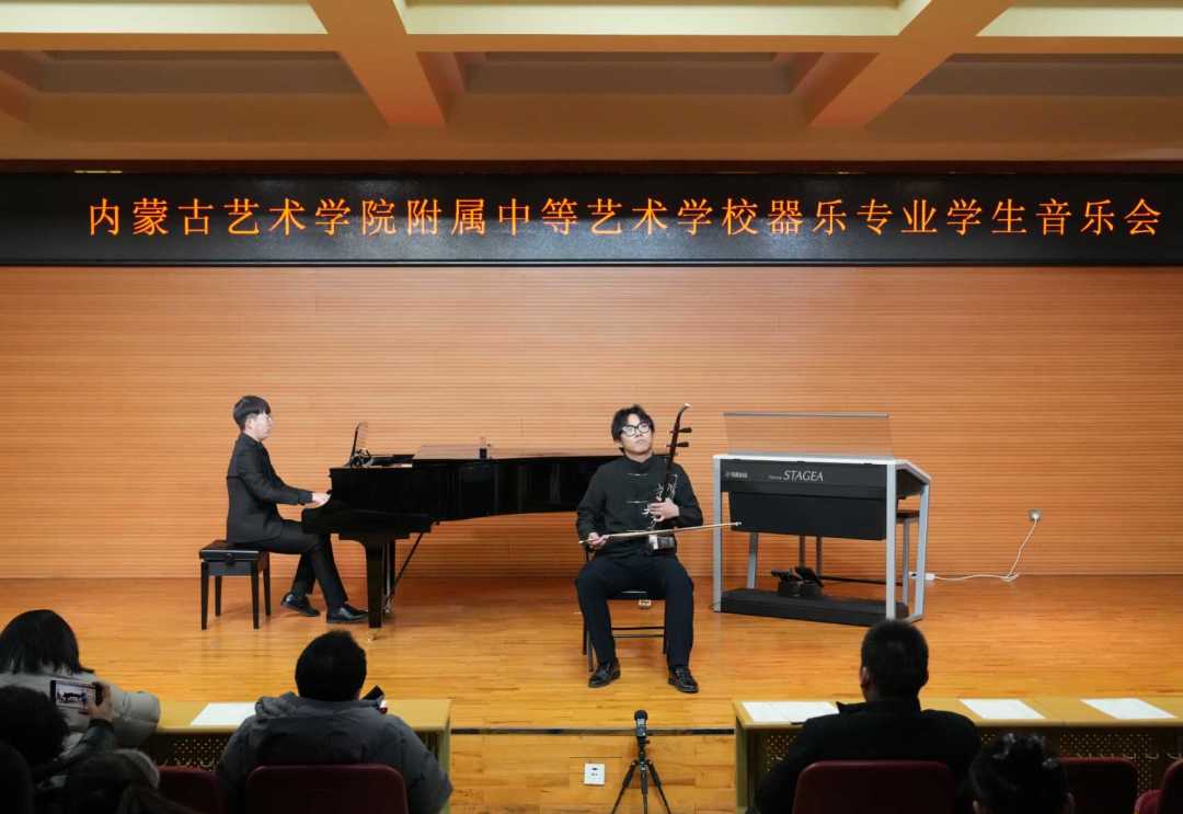 曹博闻(初三年级钢琴专业)带来的《意大利协奏曲》是巴赫融合德国复调与意大利协奏曲范式的经典之作,他的演奏声部层次清晰,较好的突出了复调作品的特点;哈那嘎尔(高二年级低音马头琴专业)演奏的《亦赫胡尔与钢琴协奏曲》采用蒙古族传统五声调式,旋律线条悠扬婉转,低音马头琴音色深沉浑厚,与钢琴的和声色彩形成对比与融合;贾宇坤(高三年级钢琴专业)演绎的贝多芬《热情奏鸣曲》第三乐章以暴风雨般的主题展开,百折不挠的气势贯穿整个乐章,节奏明快,激昂振奋;黄俊威(高二年级马头琴专业)演奏的《乌力吉巴雅尔第四马头琴协奏曲》将20世纪的现代作曲技法与传统的马头琴音乐体裁相结合,实现了传统与现代的创新性融合;任尔东(初二年级小提琴专业)的小提琴曲《前奏与快板》前奏的节奏强烈,注重强弱和音色的变化,突出主旋律的音色和动感,快板和声复杂,包含了大量的双音和跨弦技巧,注重音乐表现了和情感的表达;那仁夫(高二年级钢琴专业)的钢琴独奏曲《g小调狂想曲》全曲通过三连音贯穿主题,“主题动机贯穿”和“展开性变奏”巧妙运用,是勃拉姆斯创作成熟期的杰作,体现了他的浪漫主义情怀;结束曲张赢(高二年级二胡专业)的二胡独奏《雪山魂塑》曲调优美婉转,意境生动,独具特色,是刘文金先生为纪念长征胜利七十周年而作,描写了战士们在严酷环境下浴血奋战的革命斗志以及在长征途中的战友情。