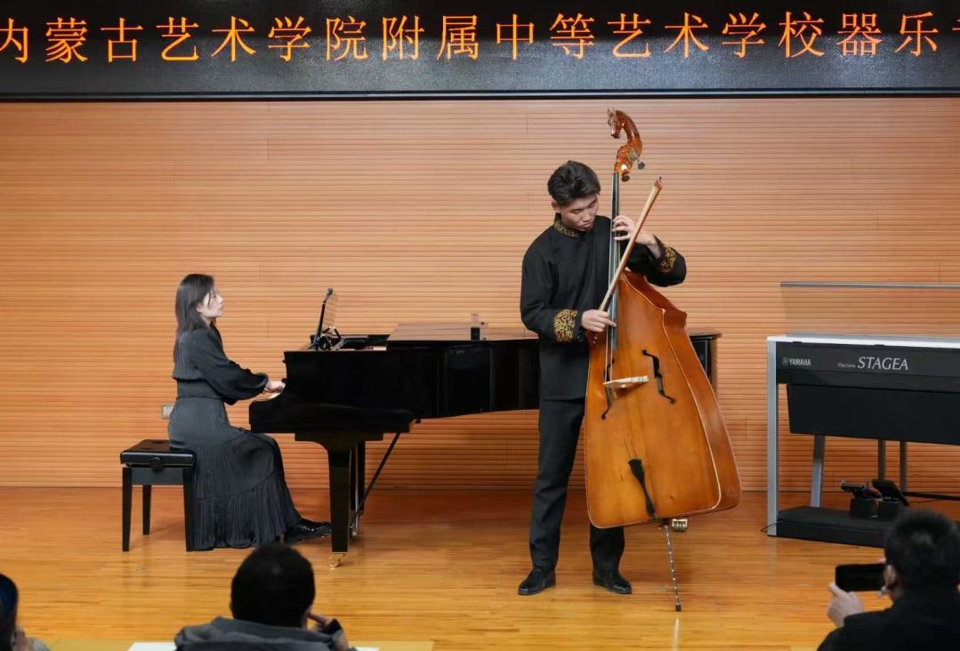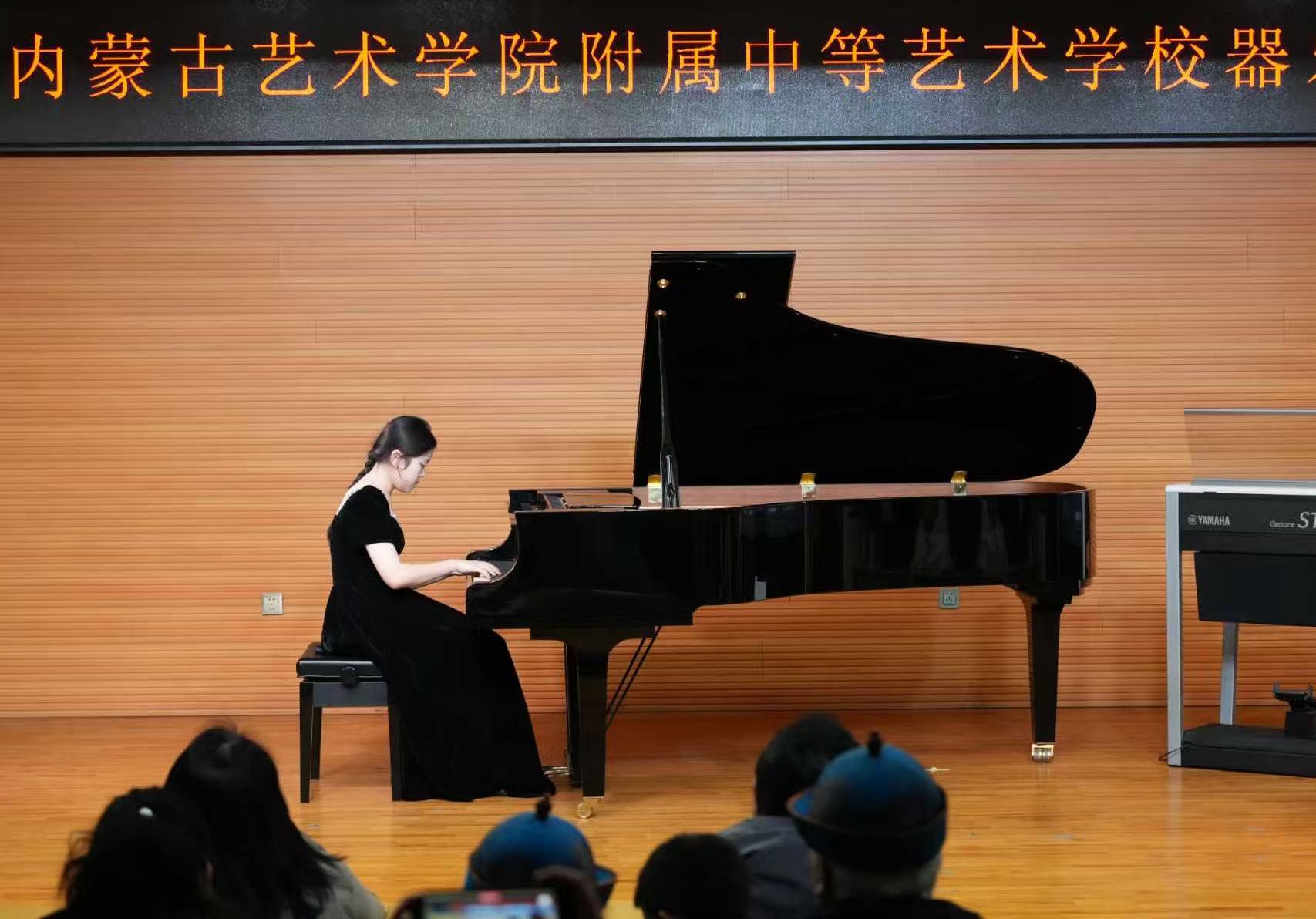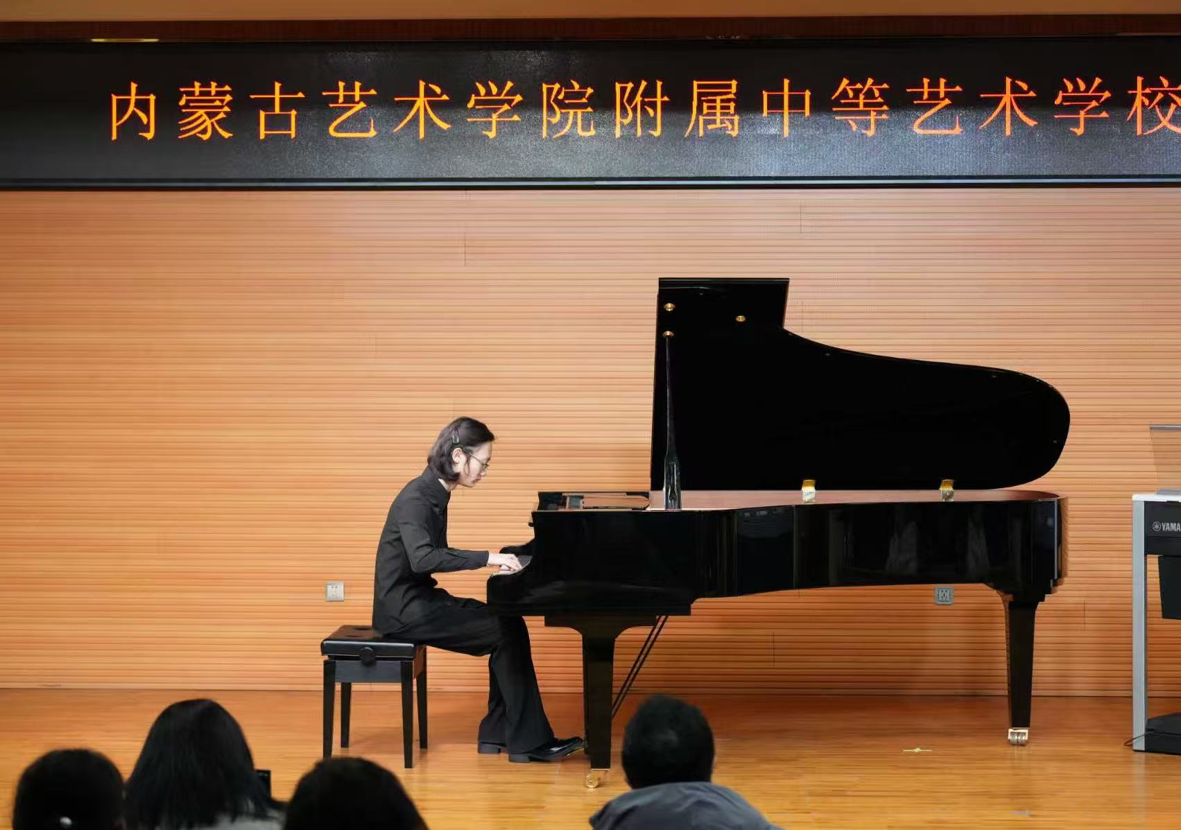 曹博闻(初三年级钢琴专业)带来的《意大利协奏曲》是巴赫融合德国复调与意大利协奏曲范式的经典之作,他的演奏声部层次清晰,较好的突出了复调作品的特点;哈那嘎尔(高二年级低音马头琴专业)演奏的《亦赫胡尔与钢琴协奏曲》采用蒙古族传统五声调式,旋律线条悠扬婉转,低音马头琴音色深沉浑厚,与钢琴的和声色彩形成对比与融合;贾宇坤(高三年级钢琴专业)演绎的贝多芬《热情奏鸣曲》第三乐章以暴风雨般的主题展开,百折不挠的气势贯穿整个乐章,节奏明快,激昂振奋;黄俊威(高二年级马头琴专业)演奏的《乌力吉巴雅尔第四马头琴协奏曲》将20世纪的现代作曲技法与传统的马头琴音乐体裁相结合,实现了传统与现代的创新性融合;任尔东(初二年级小提琴专业)的小提琴曲《前奏与快板》前奏的节奏强烈,注重强弱和音色的变化,突出主旋律的音色和动感,快板和声复杂,包含了大量的双音和跨弦技巧,注重音乐表现了和情感的表达;那仁夫(高二年级钢琴专业)的钢琴独奏曲《g小调狂想曲》全曲通过三连音贯穿主题,“主题动机贯穿”和“展开性变奏”巧妙运用,是勃拉姆斯创作成熟期的杰作,体现了他的浪漫主义情怀;结束曲张赢(高二年级二胡专业)的二胡独奏《雪山魂塑》曲调优美婉转,意境生动,独具特色,是刘文金先生为纪念长征胜利七十周年而作,描写了战士们在严酷环境下浴血奋战的革命斗志以及在长征途中的战友情。