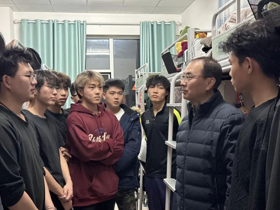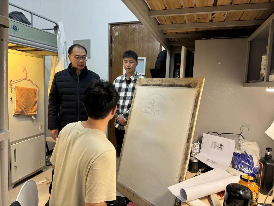 美术学院党总支书记景磊带领团学干部定期深入宿舍,与学生们面对面交流,了解他们的学习进展、生活状况以及内心的想法和困惑。围绕我校“22352”打造高素质艺术人才培养的“内艺模式”与同学们交流并给予针对性的指导和建议,帮助学生们更好地规划学业,明确未来的方向。同时,特别提醒同学们增强安全意识,诚信考试。