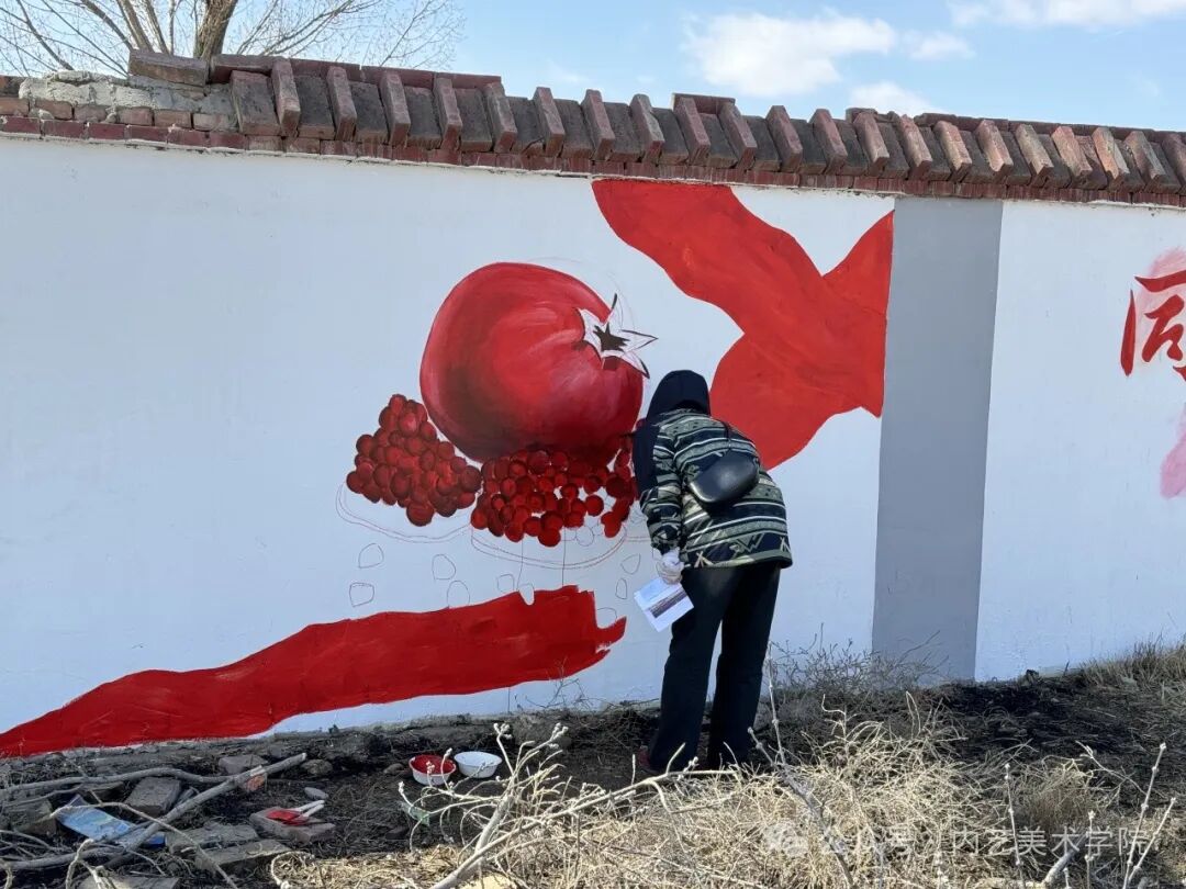 本次活动由爱民老师带队,师生齐心协力,发挥专业特长,调色、勾勒线条,将一幅幅生动有趣的图案呈现在墙壁上。在他们的巧手下,原本单调的墙面变得栩栩如生。同学们以“艺”传情,用艺术服务乡村,为村容村貌增姿添彩,为美丽乡村建设注入了青春力量。