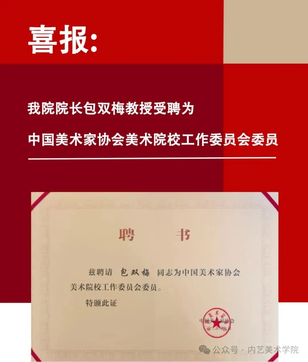 2025年9月13日,中国美术家协会工作委员会成立会议在北京举行,中国美协美术院校工作委员会、美术新闻媒体工作委员会、新文艺群体工作委员会、青年美术家工作委员会四个工作委员会正式成立。我院院长包双梅教授受聘为中国美术家协会美术院校工作委员会委员。