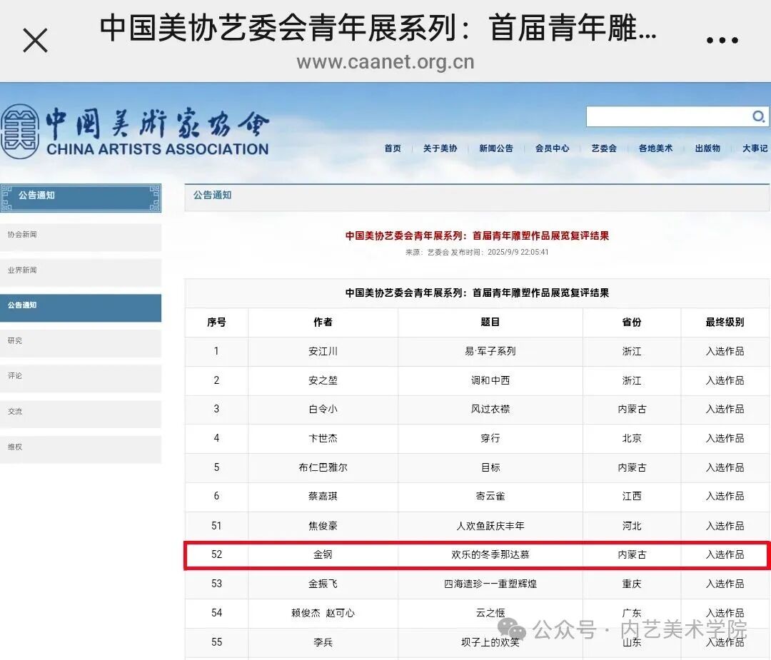 为贯彻落实习近平文化思想和习近平总书记关于青年工作的重要思想,坚持以人民为中心的创作导向,推出更多增强人民精神力量、充满时代气息、具有中华特色的精品力作,培育优秀的雕塑艺术青年人才创作队伍。中国美术家协会、河北省文学艺术界联合会、河北美术学院共同举办的“首届青年雕塑作品展览”复评结果于9月9日正式揭晓。我院教师金钢的作品《欢乐的冬季那达慕》成功入选。