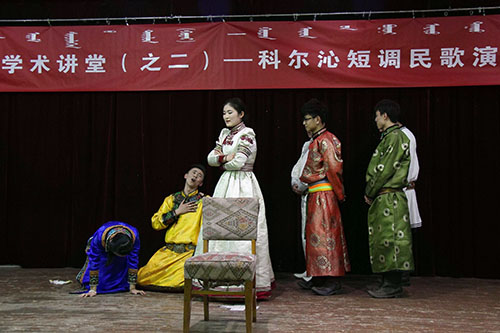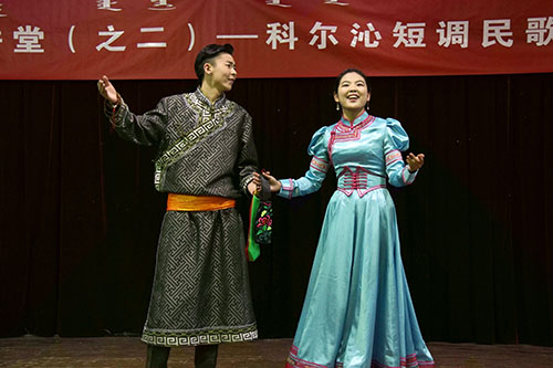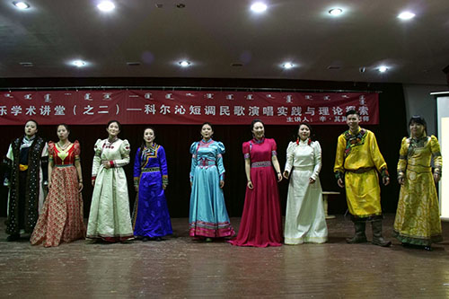 讲座最后,辛•其其格老师挑选了较有代表性的《爱之心》《仁钦哥哥》《锡路》和《扎纳巴拉吉尼玛》等十首不同风格的科尔沁短调民歌让她所教的在校本科学生进行了演绎。学生们以独唱、对唱、情景剧等形式用蒙语原文展示了科尔沁短调民歌的艺术魅力。