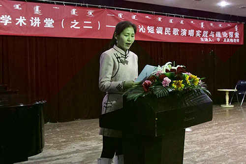 2015年4月2日晚7;00,我院音乐学院声乐歌剧系在小音乐厅成功举办了“声乐学术讲堂之二——科尔沁短调民歌演唱实践与理论探索”的学术讲座,本次讲座由辛•其其格老师主讲,辛•其其格老师首先介绍了蒙古族科尔沁部的来历、分布地区以及科尔沁短调民歌形成的历史文化背景。随后,她对科尔沁短调民歌的文学内涵、音乐特征、题材体裁等方面进行了详细解读。