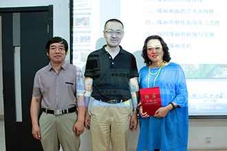 2015年7月9日上午8点,我院艺术设计系邀请厦门大学美术系刘晓杰教授进行以《解析中国现代漆画技法》为主题的学术讲座。艺术设计系主任赵志生教授致辞,并向刘晓杰教授颁发艺术设计系客座教授的聘书。艺术设计系装饰艺术设计教研室主任哨布教授主持了本场学术讲座,来自艺术设计系的师生100余人聆听了讲座。