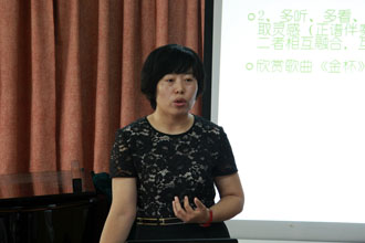 2015年7月10日上午9点,音乐学院钢琴基础教研室成莉老师在我院办公楼402(多功能厅)为我院师生成功举办了题为《钢琴即兴伴奏艺术之我见》的学术讲座。成莉老师首先对钢琴即兴伴奏的内涵、适用范围以及重要性做了简要介绍,之后主要围绕钢琴即兴伴奏构成的五大要素展开阐述:1、钢琴弹奏技巧;2、和声基础;3、伴奏音型;4、歌曲的分析;5、综合应用能力,同时针对每一个要素在学习中常见的问题进行了归纳与总结,并介绍了自己的一些学习方法与体会,强调要重视对正谱伴奏的分析与借鉴,重视舞台实践的锻炼。讲座中还安排了现场请同学即兴配弹伴奏的互动环节,提高了同学们学习的积极性,同时多媒体课件的播放也增添了讲座的生动性与直观性。讲座最后重点分析了歌曲《天边》钢琴伴奏的写作特点与演奏处理,并邀请一位同学共同为大家完整演绎了这首歌曲。