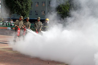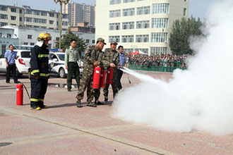 演练现场,同学们有条不紊地进行了逃生疏散演练活动,并在消防官兵的现场指导下,完成了干粉灭火器的使用操作。