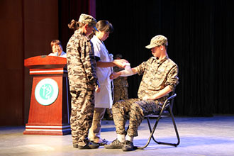 9月10日下午,由自治区红十字会和教育厅主办,内蒙古大学艺术学院承办的“内蒙古高校红十字应急救护培训示范活动及救护教具发放仪式”在我院举行。自治区红十字会党组书记、常务副会长刘菊茹,自治区教育厅党组成员、巡视员董方成,自治区红十字会党组成员、副会长邢喜成,内蒙古大学艺术学院党委书记黄海,自治区红十字会组织宣传与筹资部部长胡志行,自治区红十字会赈济救护部调研员、副部长李鑫,自治区教育厅体卫艺处副处长李晓鹏,以及驻呼15所高校负责学校军训和应急救护培训工作的老师参加了此次活动。会议由我院党委副书记兼纪委书记毅力主持。