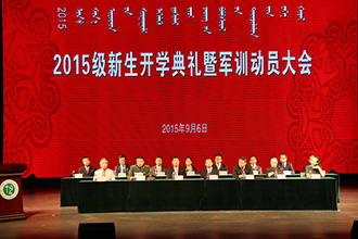 2015年9月6日,我院隆重举行了2015级新生开学典礼暨军训动员大会,大会于上午9:00和下午3:00分别在北校区演艺厅和南校区艺术楼举行。承训部队公安边防部队呼和浩特指挥学院学员大队大队长巴根中校、我院党委书记黄海、院长李玉林、党委副书记兼纪委书记毅力、副院长宋生贵、副院长赵林平、副院长孟显波,学院相关处室及各系负责人出席大会并在主席台就座,军训教官和2015级全体新生参加了大会。大会由黄海书记主持。