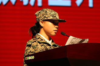 呼和浩特指挥学院学员大队大队长巴根(左图)中校讲话;学生代表发言(右图)
