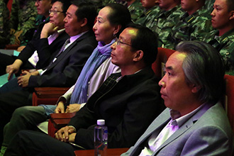 我院党委书记黄海(左图右二),我院副院长赵林平(左图右三),我院副院长孟显波(左图右一)观看晚会